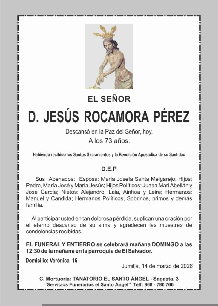 La misa funeral del señor D. Paco Cascales Bernal-Quirós, se oficiará el lunes 16 de marzo a las 19.30 horas en la iglesia de El Salvador.