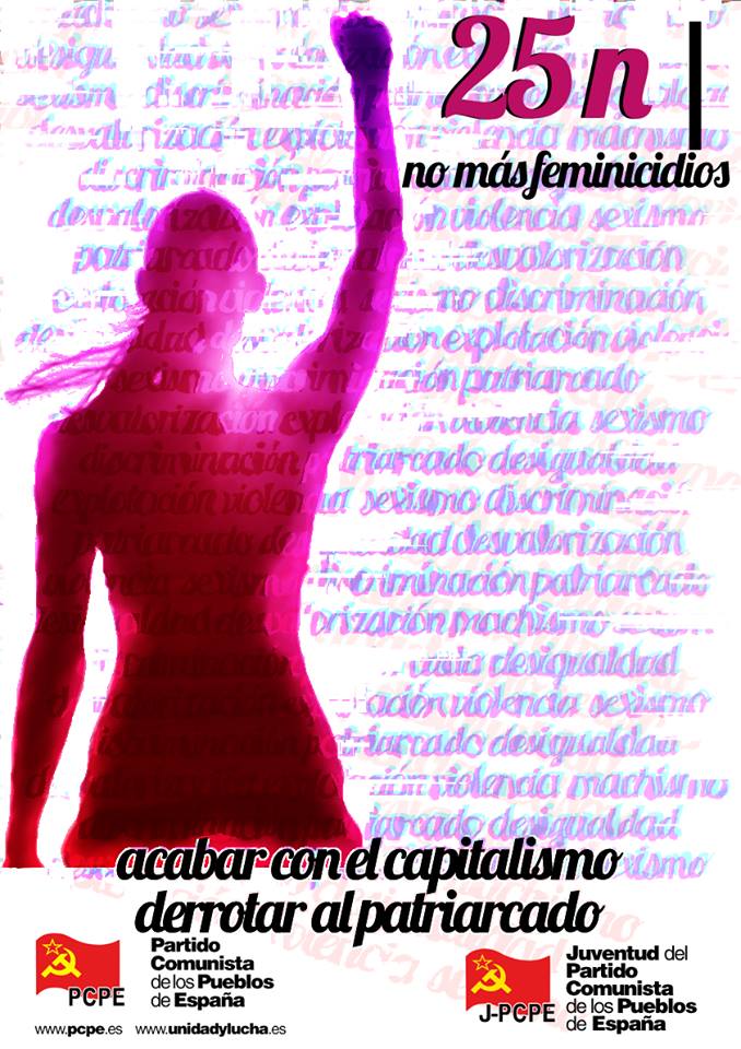 El PCPE y su juventud, al igual que el Gobierno Soviético, tiene como objetivo prioritario acabar con la discriminación, derrotar al patriarcado, y por ello, llamamos a la movilización de trabajadoras y trabajadores contra los feminicidios que las instituciones y las leyes burguesas afirman condenar mientras mantienen intactas las condiciones sociales de la desigualdad y las estructuras de opresión de las mujeres, como clase y como género. La lucha continúa más allá del 25- N y denunciamos que del día contra la violencia hacia las mujeres se ha hecho una jornada lacrimógena, interclasista y con ausencia total de una denuncia hacia esa violencia por razón de género como algo estructural y sistémico.