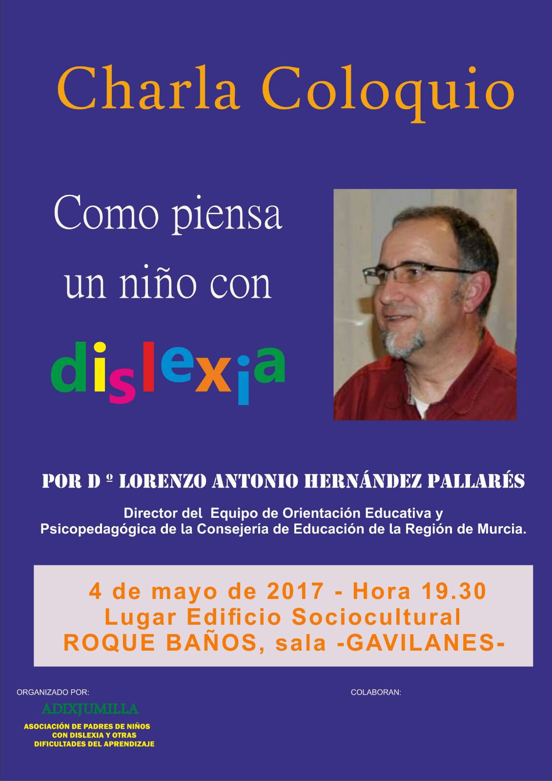 La Asociación de Padres de Niños con Dislexia y Otras Dificultades del Aprendizaje ha organizado una charla coloquio bajo el título “Cómo piensa un niño con dislexia”, que impartirá Lorenzo Antonio Hernández Pallarés,  director del Equipo de Orientación Educativa y Psicopedagógica de la Consejería de Educación de la Región de Murcia.