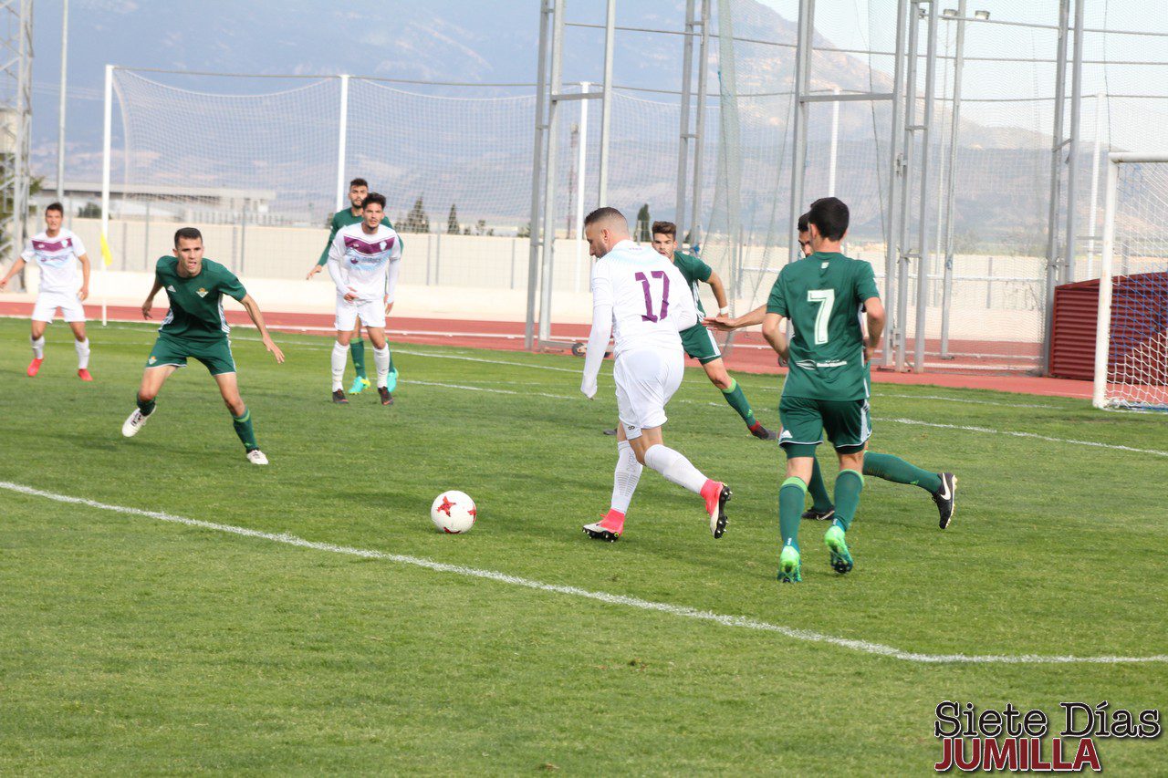 Eso sí, el Jumilla supo sobreponerse a este gol asediando el área bética y logrando poner el empate con un penalti cometido por Nacho González sobre Chaco y que transformó por el centro Fran Moreno en el minuto 25. Apenas siete minutos después, el trencilla anuló un gol a Chaco por una falta muy dudosa sobre un defensor.