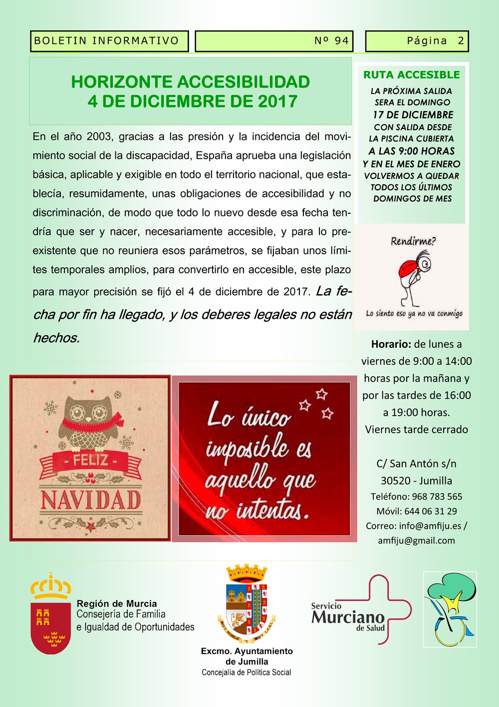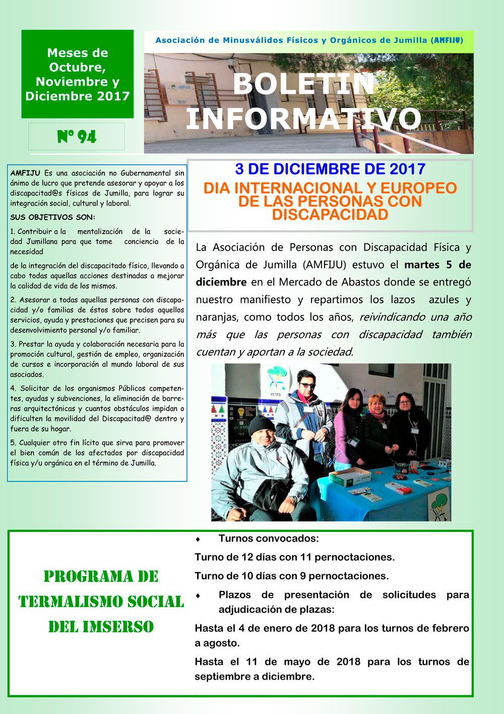La Asociación de Personas con Discapacidad Física y Orgánica de Jumilla, AMFIJU, ha publicado su boletín informativo número 94 donde principalmente reflejan sus reivindicaciones e informan del Programa de Termalismo Social.