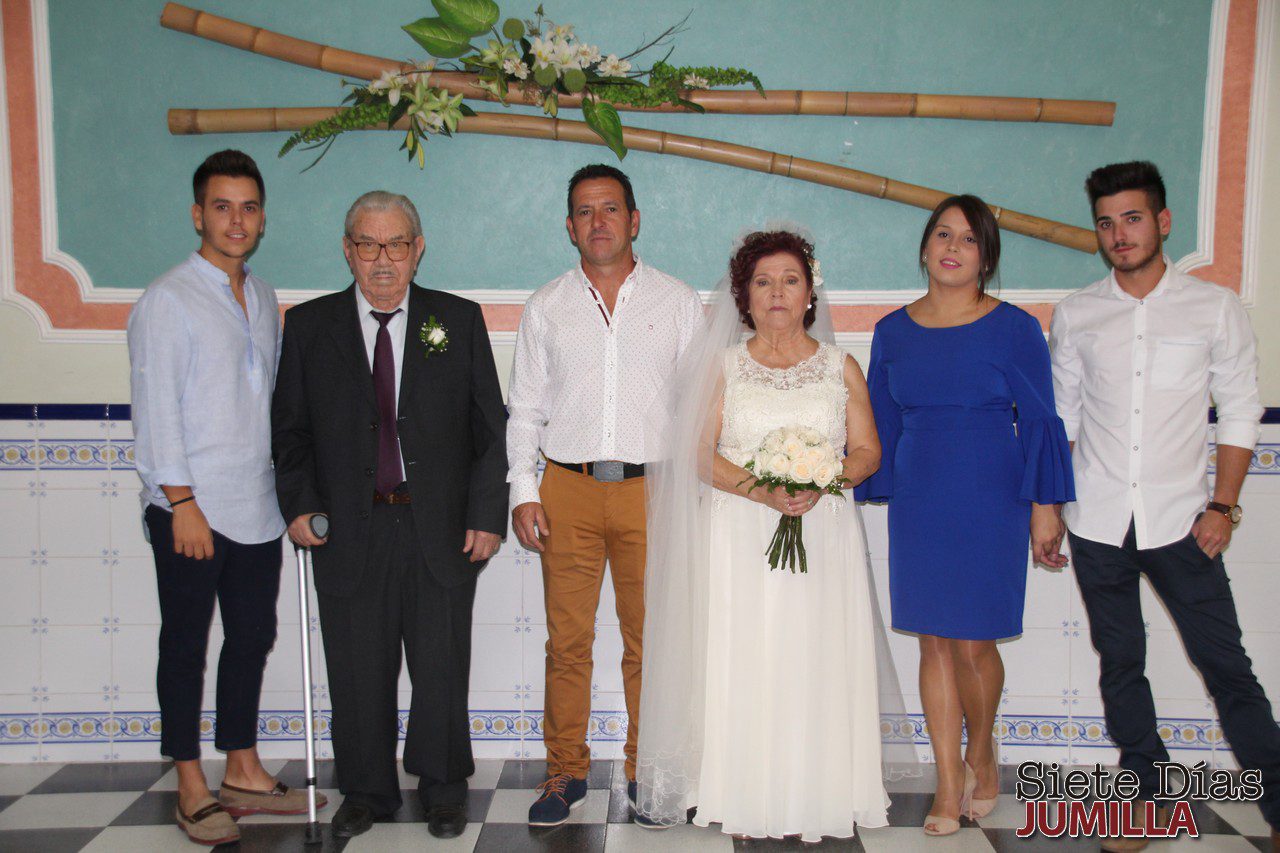 Los jumillanos Carmen Martínez Carrasco y Federico Muñoz Lozano contrajeron matrimonio el pasado domingo ante notario en su domicilio. A continuación, lo celebraron en un salón de Jumilla, junto a su familia y amigos. Una historia más que curiosa y que quedará para el recuerdo, ya que tras vivir un amor de juventud en la localidad, él tuvo que emigrar a Barcelona por trabajo, ambos se casaron y se separaron. Finalmente y tras la vuelta de Federico y cuarenta años ya de relación, al fin celebraron su amor por todo lo alto.