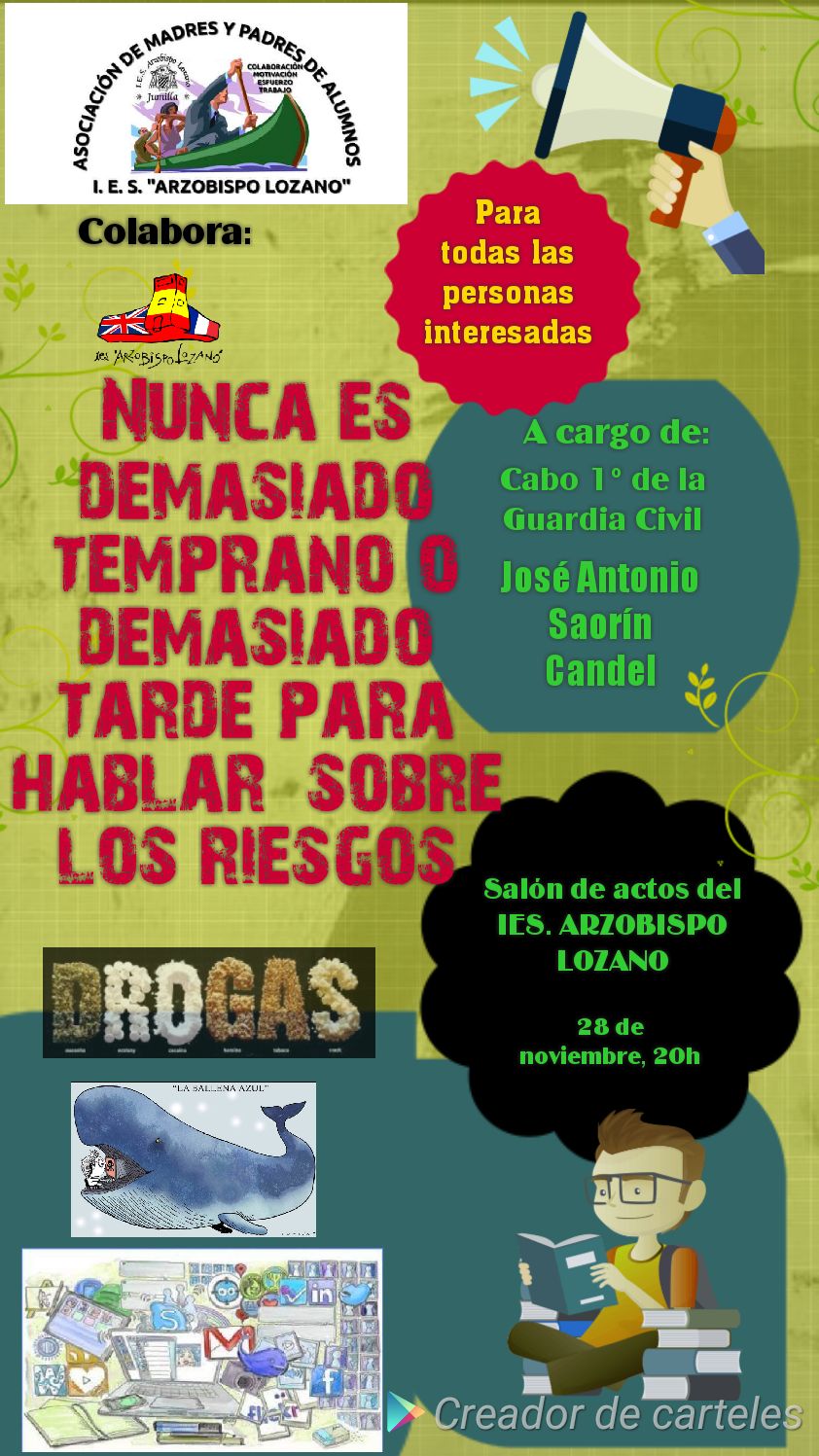 La Asociación de Madres y Padres del IES Arzobispo Lozano ha programado una charla para el martes 28 de noviembre en la que se hablará sobre drogas, porque según indican en el cartel promocional, “nunca es demasiado temprano o demasiado tarde para hablar sobre los riesgos”.