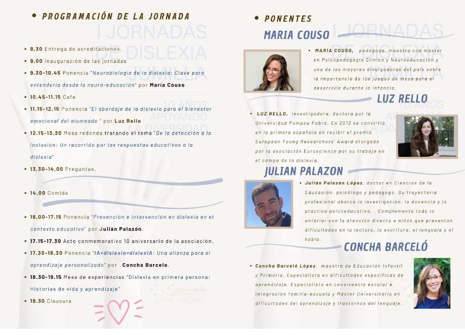 La jornada se celebrará el sábado 15 de noviembre en el Auditorio Julián Santos (aunque se estudia cambio de ubicación para poder ampliar el aforo). Será un evento formativo y conmemorativo con ponentes de prestigio como María Couso, Luz Rello, Julián Palazón y Concha Barceló, especialistas en intervención, investigación y marco legal. También habrá mesas redondas con docentes y personas con dislexia que compartirán sus experiencias. Queremos que sea un encuentro de aprendizaje y celebración colectiva.
