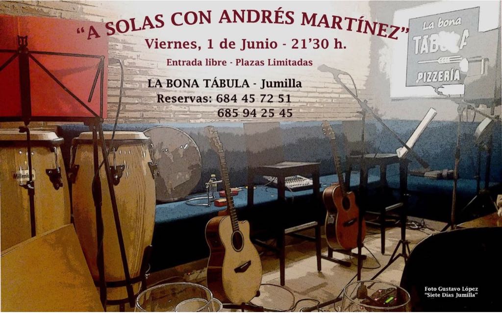Ya actuó en abril de este año presentando su último disco ‘Mar adentro’ y adelantó el tema ‘Desnudo en la playa’ y hoy vuelve a ofrecer un concierto. Hablamos del cantautor jumillano Andrés Martínez que ofrecerá una selección de su repertorio esta noche en Bona Tabula, a partir de las 21:30 horas. La entrada es libre y las plazas son limitadas. Se establece una consumición mínima de 15 euros por persona.