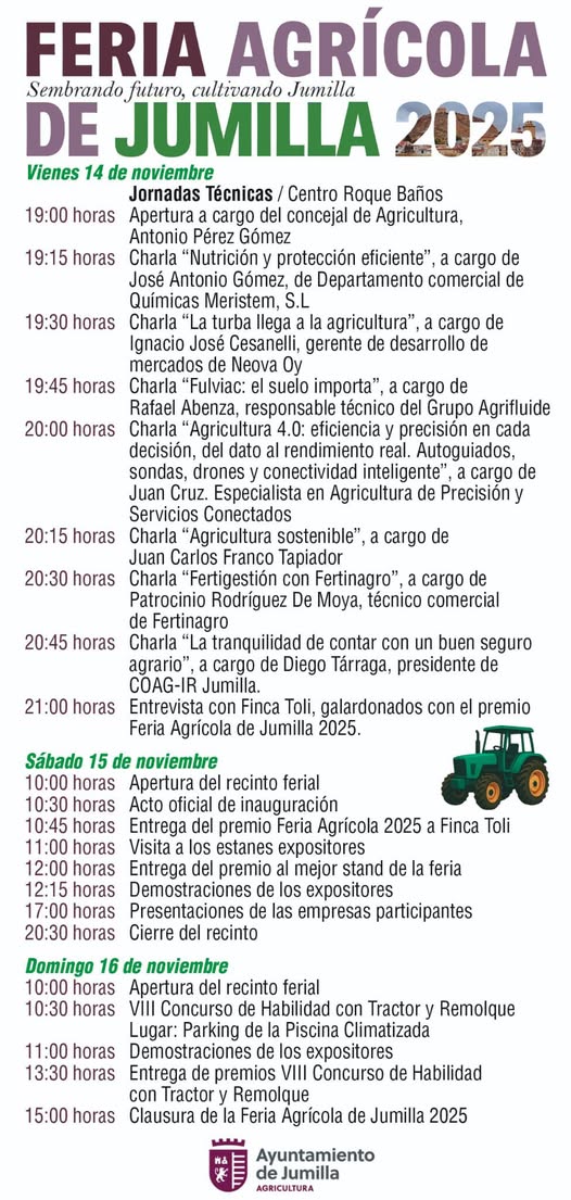 Desde aquí quiero invitar a todos, vecinos, vecinas, profesionales del sector y visitantes de fuera, a que se acerquen al Paseo Poeta Lorenzo Guardiola del 14 al 16 de noviembre. Van a encontrar innovación, tradición, actividades para todos los públicos y, sobre todo, mucho cariño por el trabajo del campo. Jumilla os espera con los brazos abiertos.