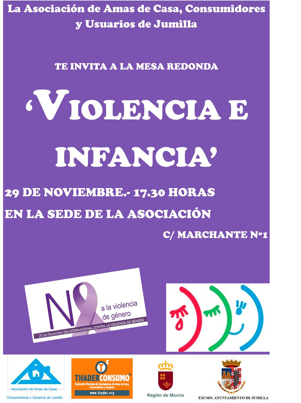 La Asociación de Amas de Casa, Consumidores y Usuarios de Jumilla informa que la charla sobre «Violencia e infancia» programada para esta tarde, ha quedado aplazada por causas de fuerza mayor hasta nuevo aviso.