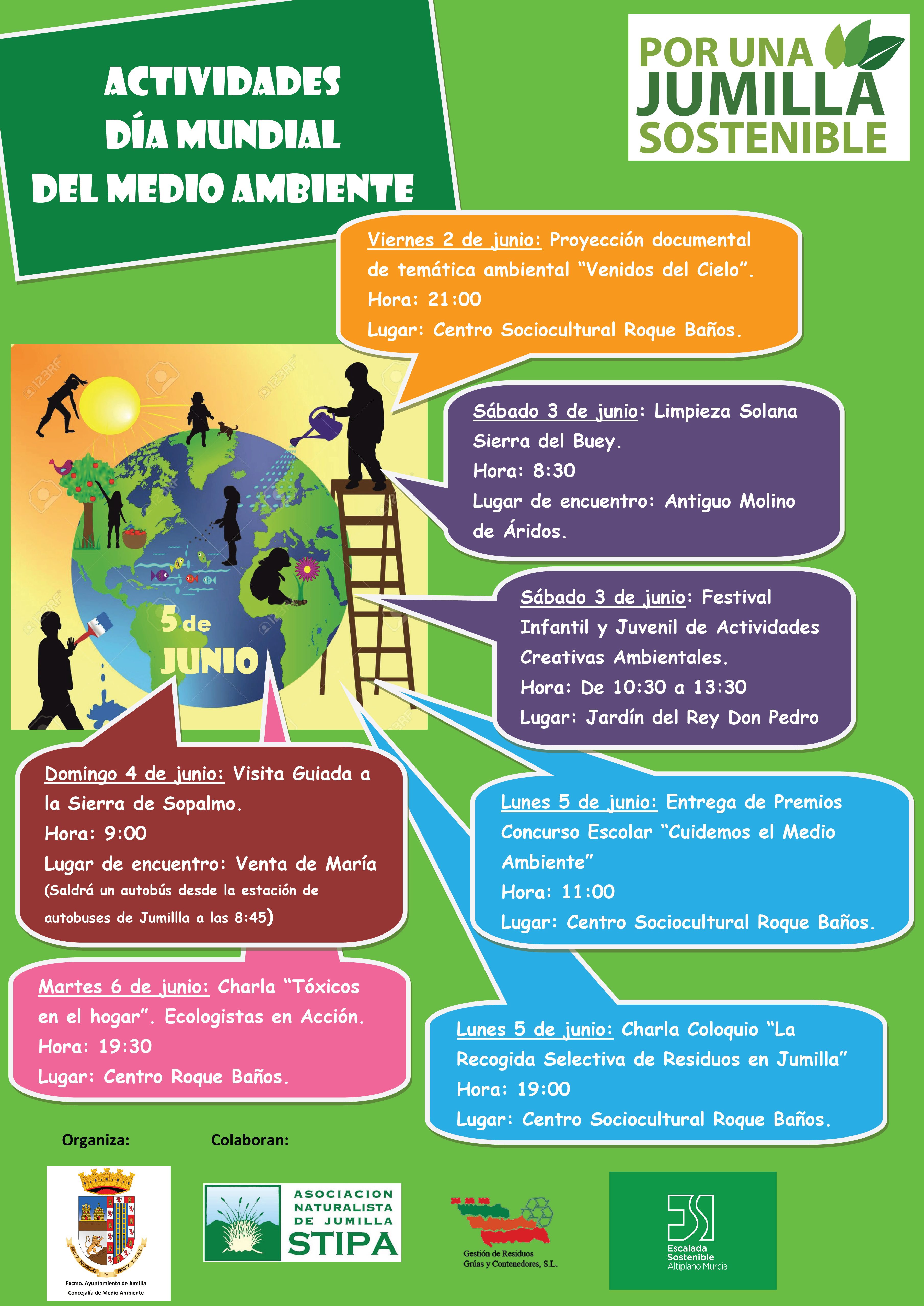 Festival Infantil y Juvenil de actividades creativas. Se llevarán a cabo varios talleres de reciclaje, juegos y deportes con material alternativo a cargo de la empresa jumillana Gestión de Residuos Grúas y Contenedores y otras actividades ambientales a cargo de la Asociación de Naturalistas de Jumilla Stipa.