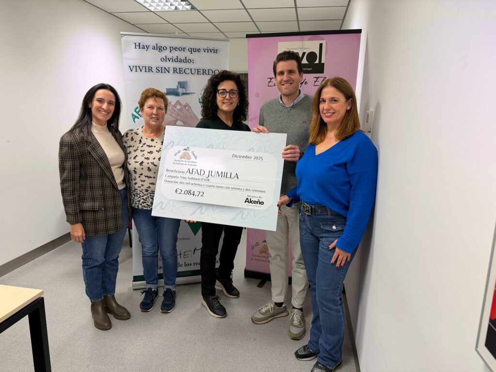 La solidaridad ha vuelto a ser visible esta semana en Jumilla, con la entrega del cheque solidario por parte de Bodegas Alceño hacia AFAD Jumilla.