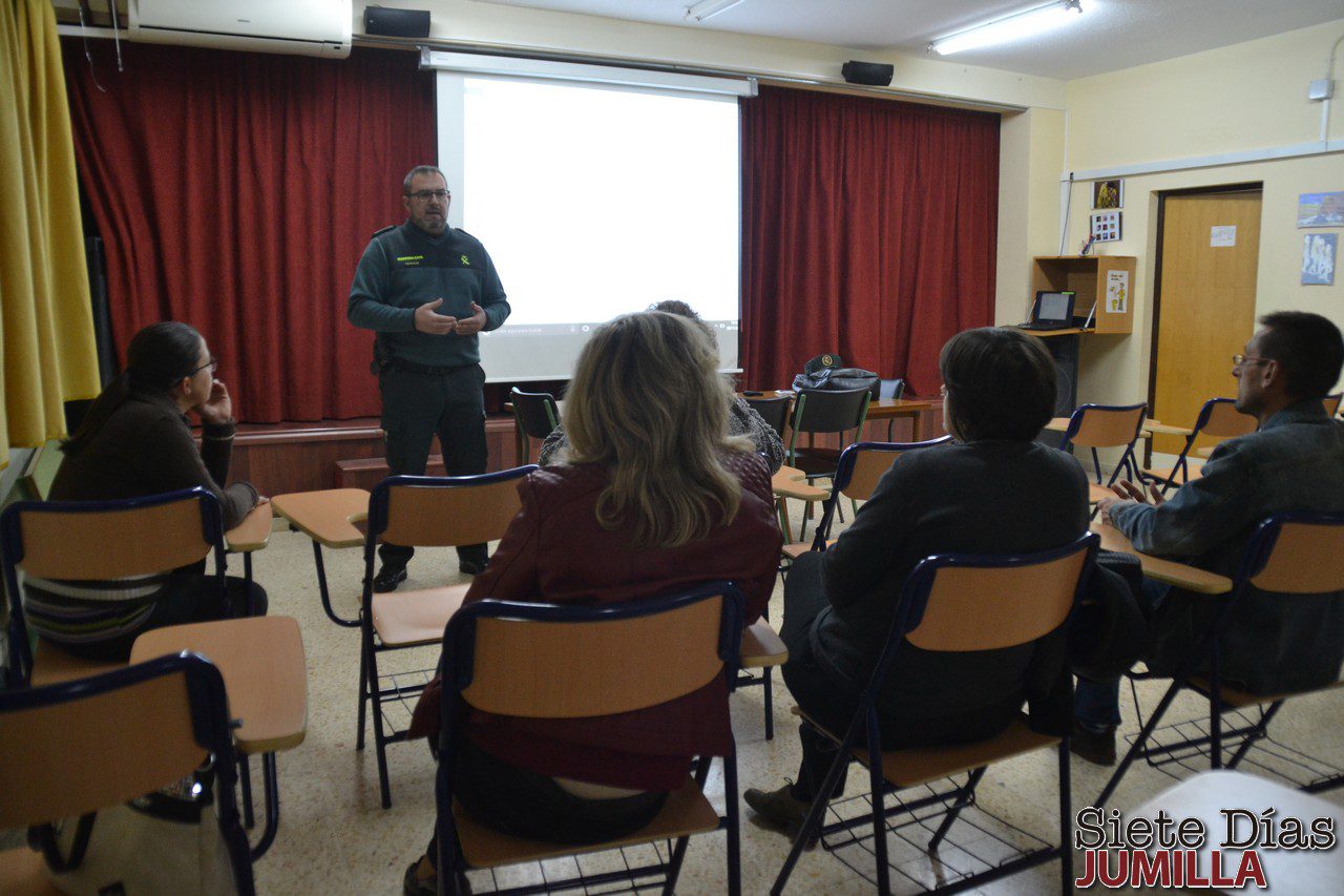 El cabo primero de la Guardia Civil, José Antonio Saorín, ofreció una charla dirigida a padres y madres del instituto Infanta Elena sobre problemas de seguridad en los centros educativos. Habló sobre riesgos y amenazas en internet y ofreció pequeñas ideas sobre consumo y efectos de sustancias estupefacientes. En cuanto a la presencia de drogas en las aulas en Jumilla, el agente asegura, que de momento no tienen constancia de que se consuma este tipo de sustancias en los centros escolares, pero lo que sí tratan es de concienciar a los padres y madres para si observan algún tipo de indicador que les pueda llamar la atención, que estén alerta y puedan comunicarlo. Sin embargo, en cuanto al acoso escolar, conocido como bullying o ciberbullying, José Antonio Saorín reconoce que está más presente y se habla mucho de campañas de concienciación, a modo preventivo, para que los padres estén también atentos a cualquier conducta anómala del niño. Esta actividad se incluye dentro del Plan Director para la convivencia y mejora de la seguridad en los centros educativos.