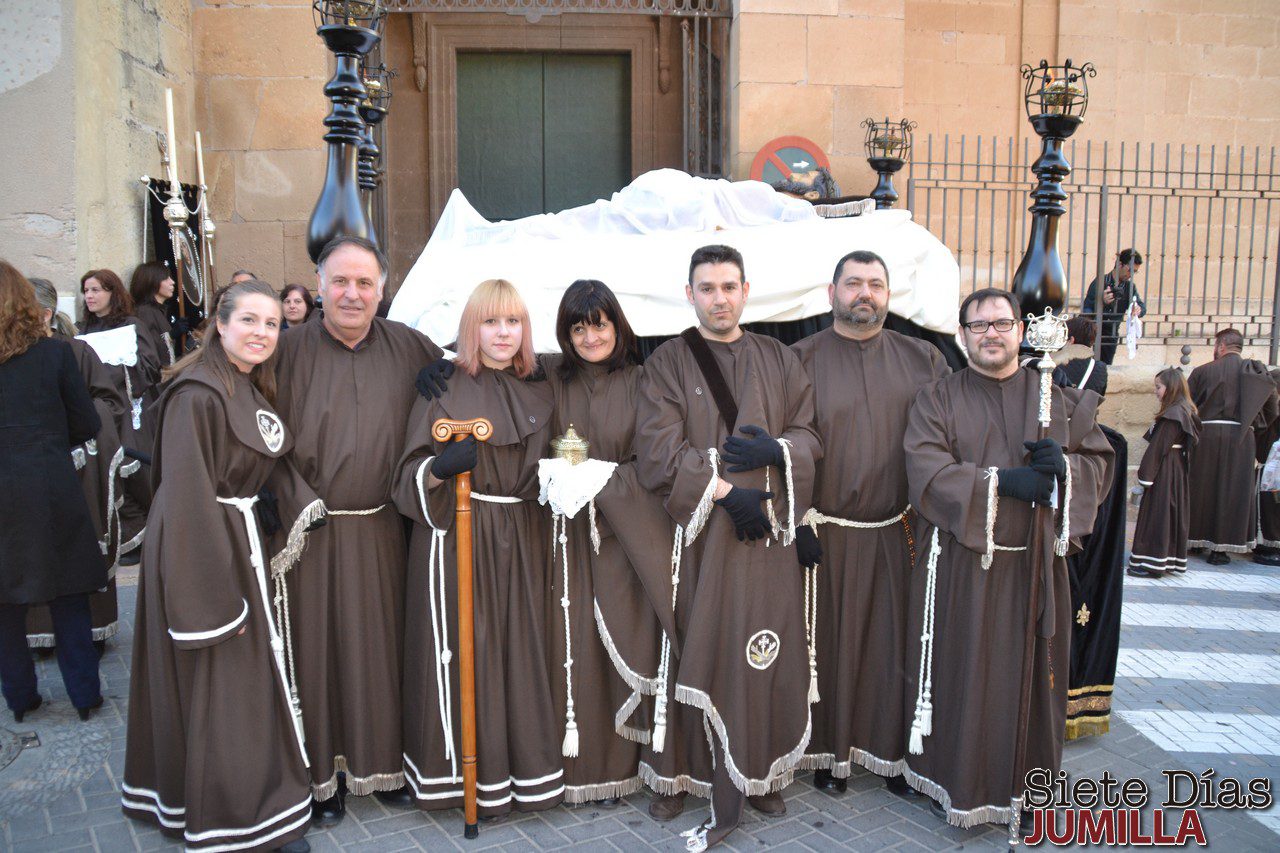 La Cofradía de la Guarda del Cuerpo de Cristo procesiona con la imagen del Yacente de Santa Ana y la Virgen de las Penas en la tarde del Sábado Santo en la procesión de La Redención.