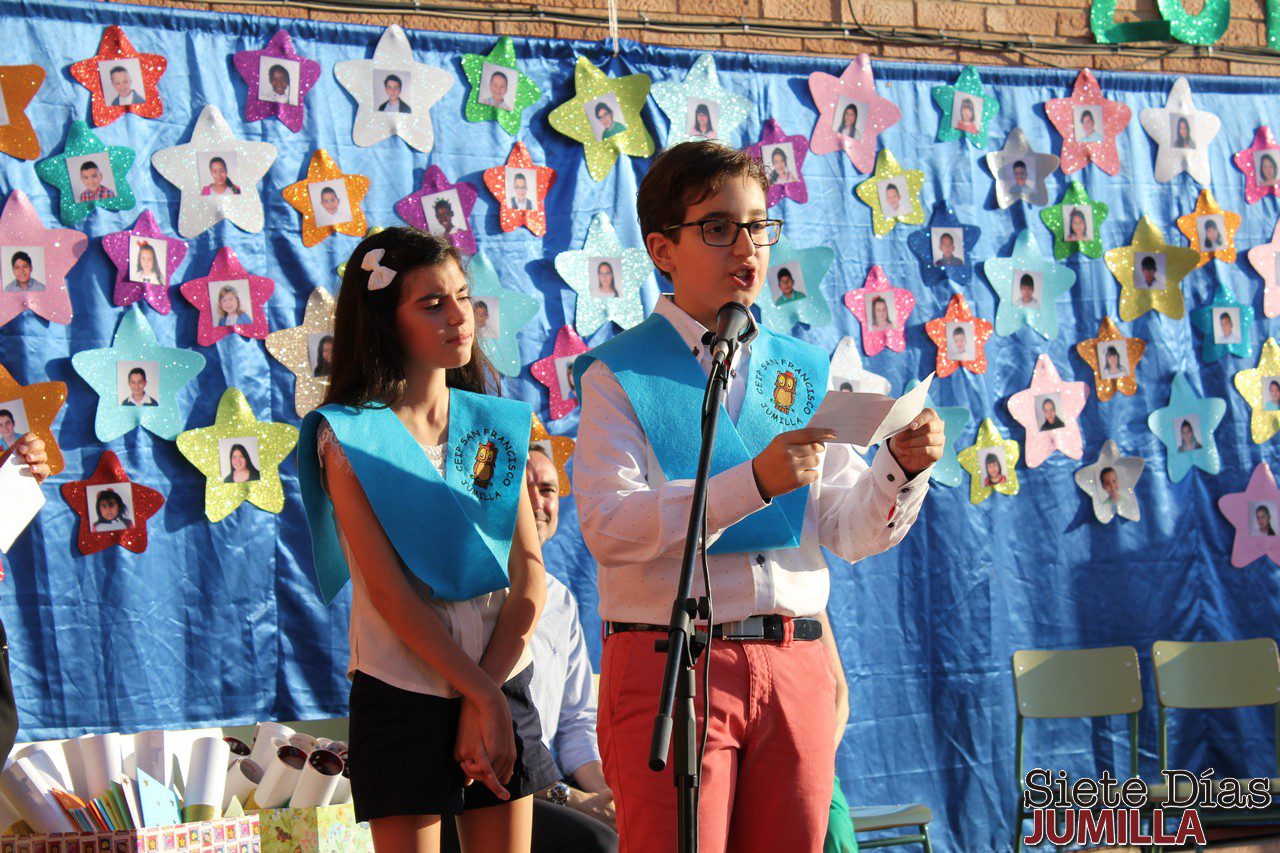 Tras los pequeños pasaron por el escenario los alumnos de Sexto Primaria. Para esta graduación en primer lugar intervinieron las maestras que han guiado a los niños hasta este punto en el que finalizan su ciclo en el colegio. Tras las educadoras, los niños fueron recibiendo por orden sus orlas, además de unas curiosas becas azules con la mascota del centro, el búho SanFran. Finalmente dos alumnos del centro tomaron la palabra para dar un discurso de agradecimiento al colegio, sus profesores y a sus padres.