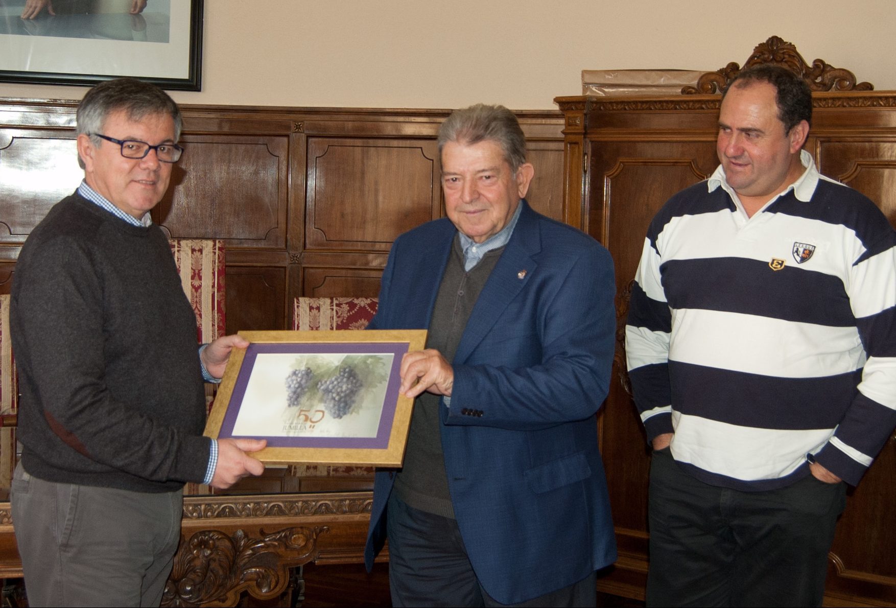 El primer edil de Hellín recibió de manos de Lencina el obsequio, consistente en en un cuadro pintado por Pedro Cano y la botella especial conmemorativa, envasada por el Consejo, con un vino representativo de la zona, que el Consejo Regulador está entregando a todos los municipios de la DO en conmemoración del 50 aniversario de su fundación.