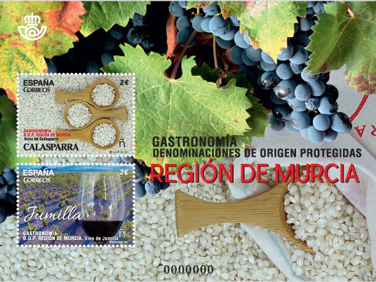 Correos acaba de emitir dos nuevos sellos, dentro de la serie “Gastronomía”, y que ha dedicado al arroz de Calasparra y al vino de Jumilla, dos productos que están incluidos en sendas denominaciones de origen protegidas de la Región de Murcia.