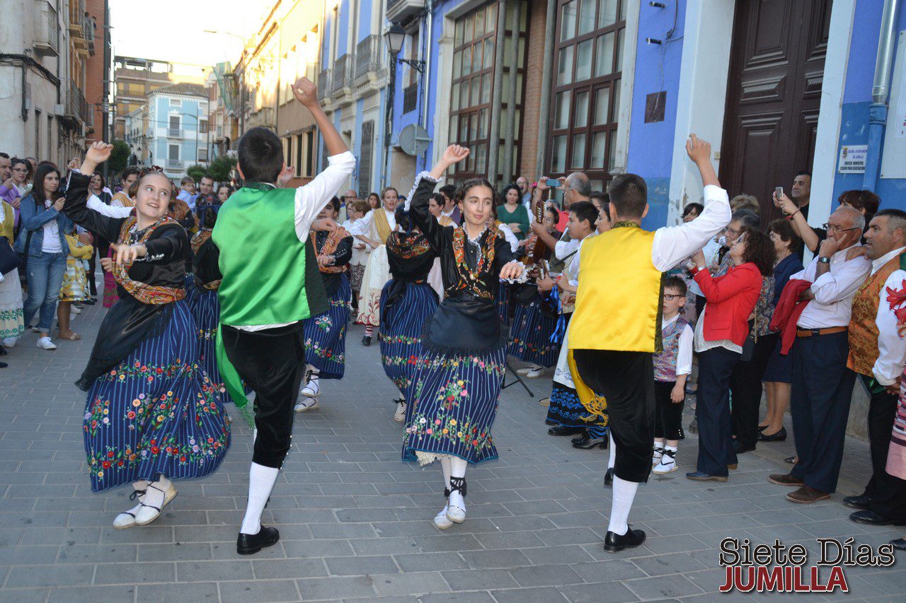 Envueltos en una soleada tarde, cientos de devotos jumillanos participaron en la tradicional ofrenda de flores al Cristo de la Columna. Sobre las ocho de la tarde, salía el cortejo que formó en la plaza del Rollo, pasando por la calle Cánovas hasta llegar a la Iglesia Mayor de Santiago, donde aguardaba la imagen. Tomaron parte las asociaciones de vecinos de Jumilla, así como pedanías, colectivos festeros, empresas, distintas instituciones y una gran cantidad de jumillanos ataviados con el traje típico. Además, tras el estandarte de la Hermandad del Cristo se pudo disfrutar de las actuaciones de las escuelas de baile del grupo de Coros y Danzas Francisco Salzillo, que a lo largo del itinerario iban bailando y cantando los principales temas del folklore local. Tras ellos, los tambores de los Armaos, y la música de la Banda Julián Santos y la AJAM.