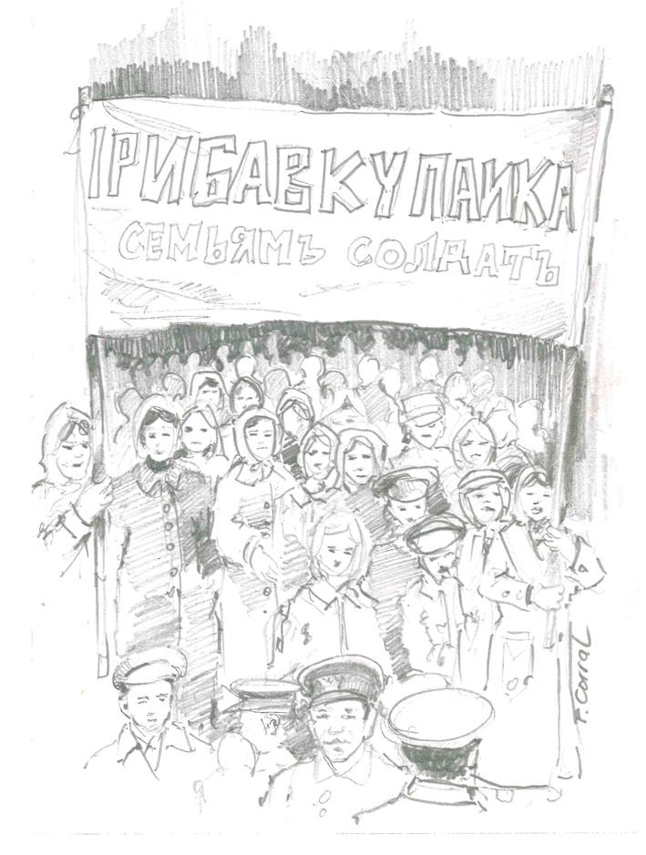 “¿Quiénes fueron las mujeres que participaron en la Gran Revolución de Octubre? ¿Fueron casos aislados? No; hubo multitudes de ellas: decenas, centenas de miles de heroínas anónimas que marcharon –codo con codo– con los obreros y campesinos, bajo la Bandera Roja y la consigna de los Soviets, pasando sobre las ruinas de la teocracia zarista hacia un nuevo futuro… Si uno mira hacia atrás, al pasado, uno puede verlas: masas de heroínas anónimas que Octubre encontró viviendo en ciudades desfallecientes, en aldeas empobrecidas saqueadas por la guerra… Una bufanda en la cabeza (raras veces una pañoleta roja), un vestido gastado, un abrigo de invierno remendado. Jóvenes y adultas, obreras y campesinas esposas de soldados y amas de casa pobres de la ciudad.