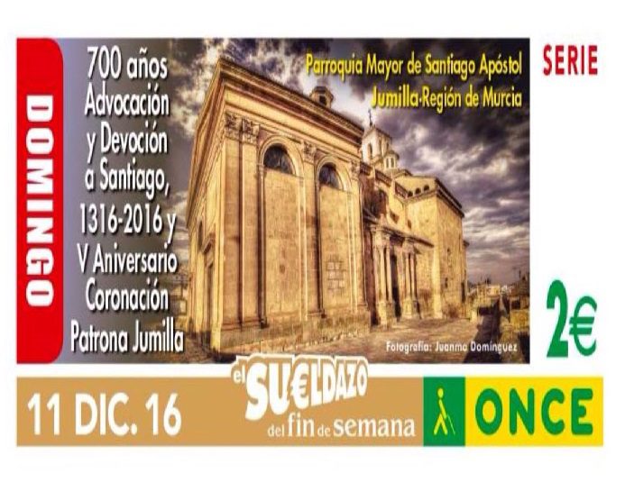 cupon-santiagoEl próximo domingo 11 de diciembre, la Organización Nacional de Ciegos ilustrará su cupón del día con la imagen de la Parroquia Mayor de Santiago, una fotografía del jumillano Juanma Domínguez. Además en la ilustración figurará también el texto relativo al 700 Aniversario de la Advocación como Parroquia en Jumilla de Santiago Apóstol, así como del V Aniversario de la Coronación Canónica de la Patrona de Jumilla.