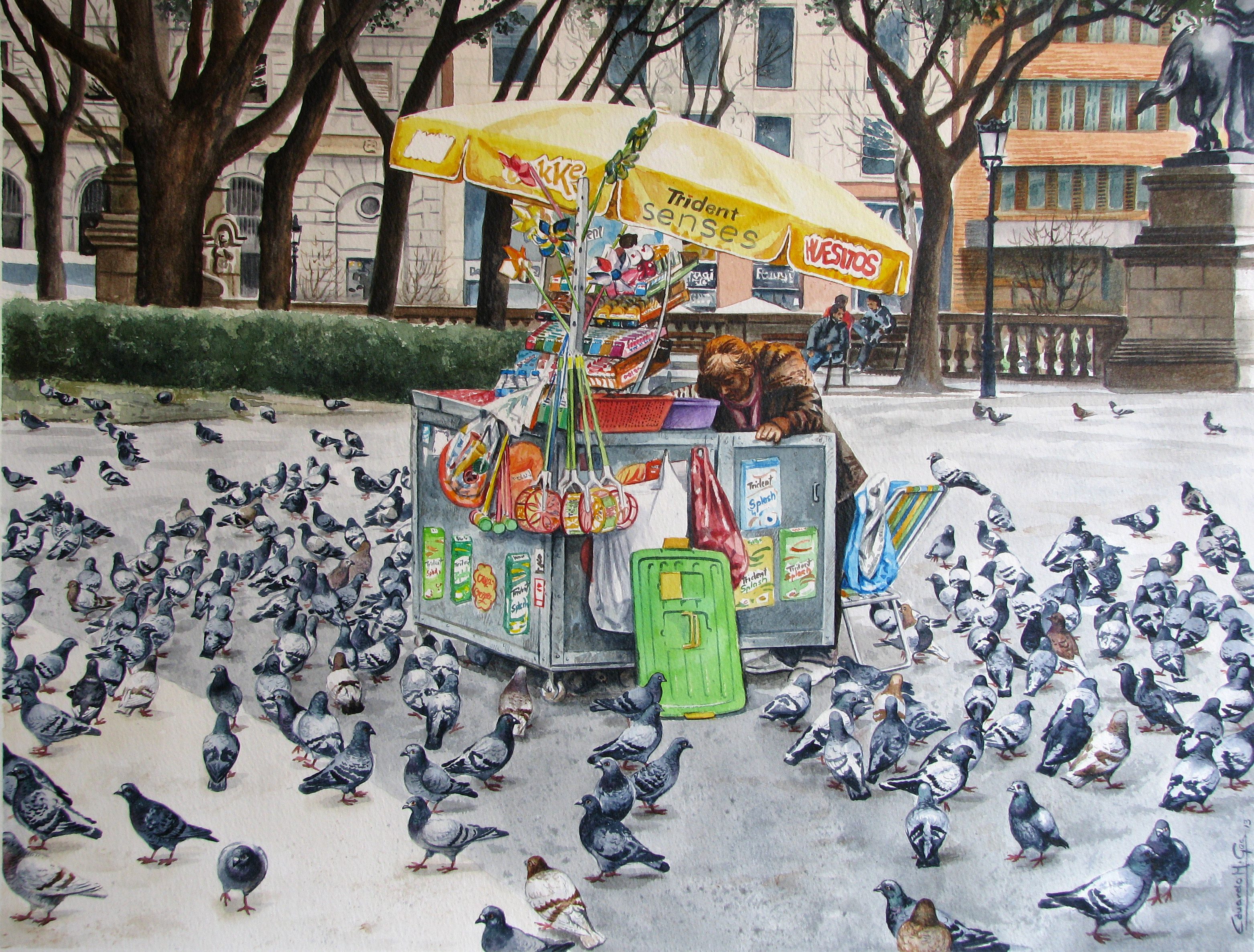 La pintura la realizó a partir de una instantanéa captada por su hermana, Isabel Gea, en la Plaza Cataluña de Barcelona.