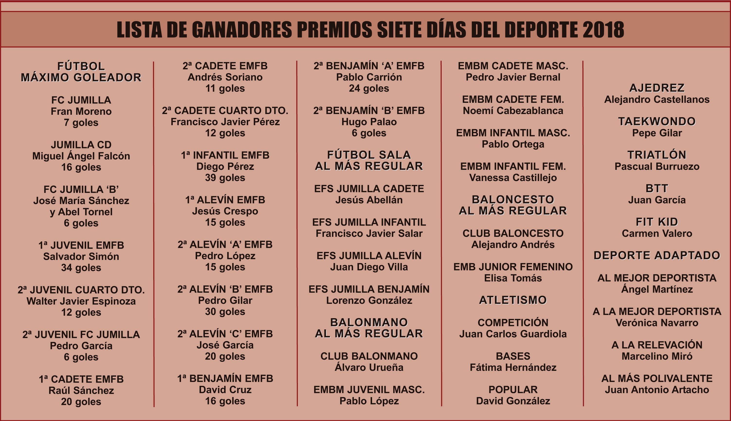 Un año más y coincidiendo con el final de temporada de la mayoría de competiciones deportivas en los que están implicados clubes y deportistas jumillanos, la redacción de Siete Días Jumilla está preparando ya la Gala de los Premios Siete Días del Deporte 2018. Con este motivo y tras valorar las actuaciones de los distintos deportistas, hoy se publica la lista de los premiados que recogerán sus galardones el próximo viernes 29 de junio en el Teatro Vico. Por su escenario desfilarán los 42 deportistas seleccionados en los distintos deportes que componen el elenco jumillano, y al que en esta edición también se une el BTT o Mountainbike.