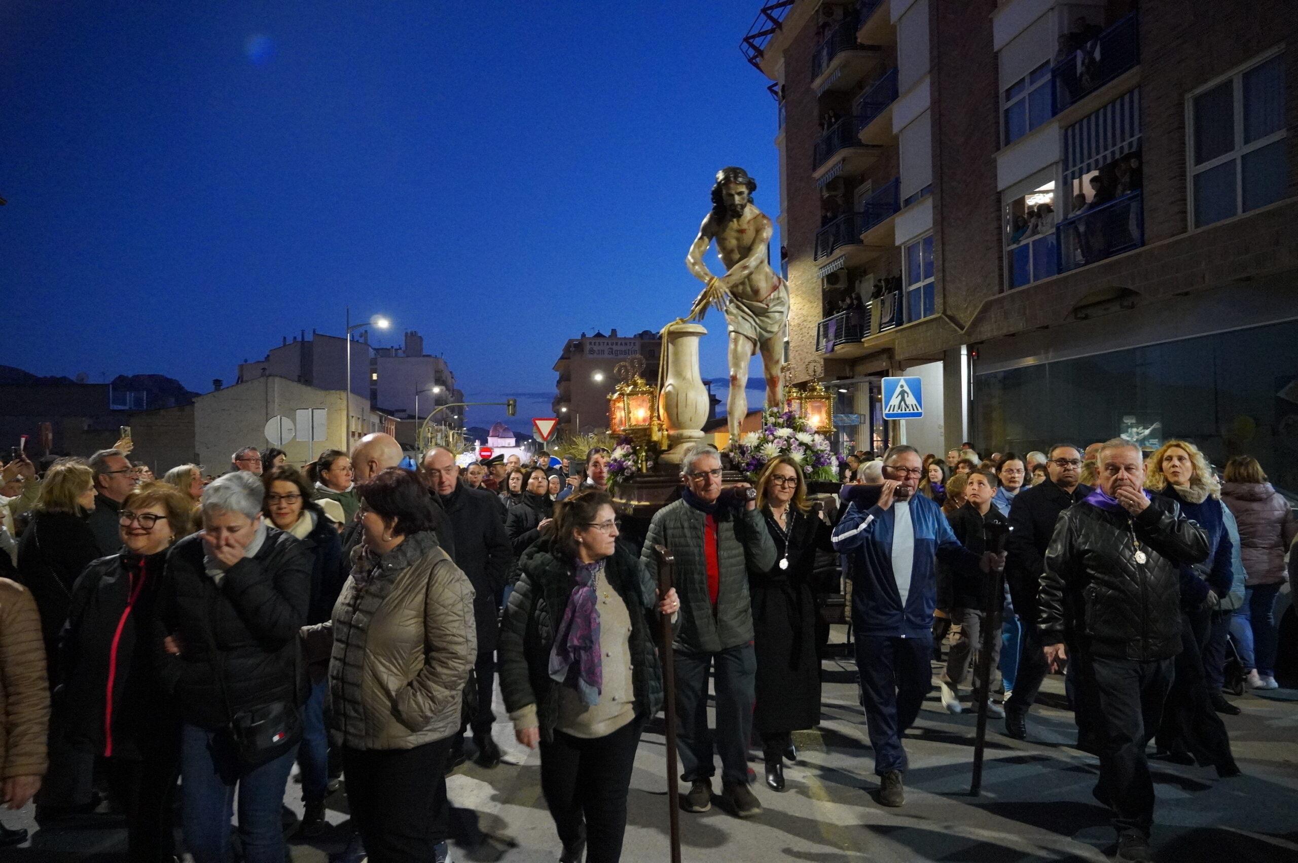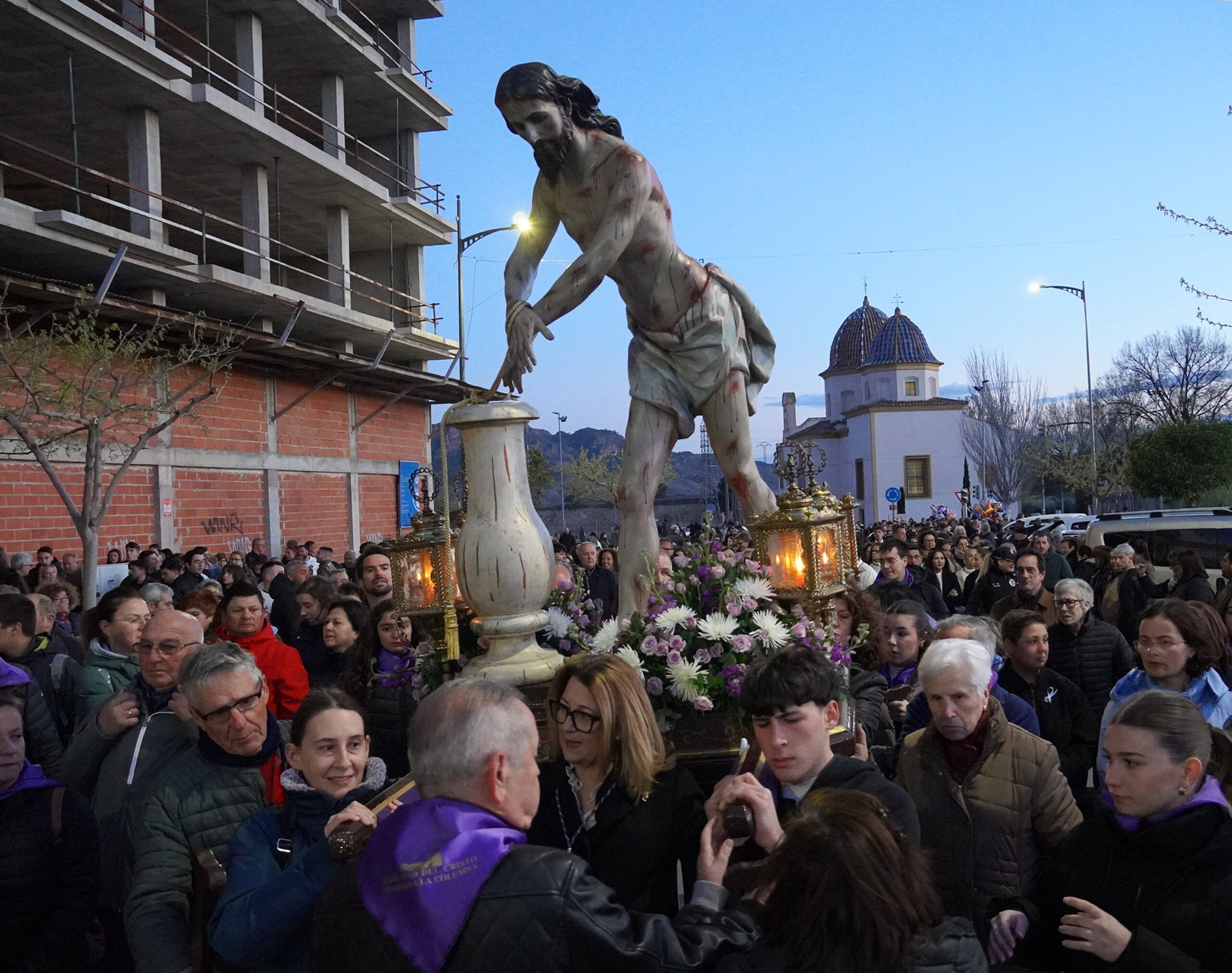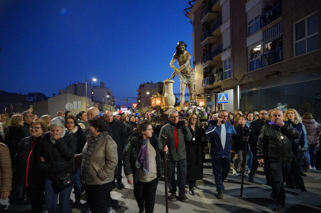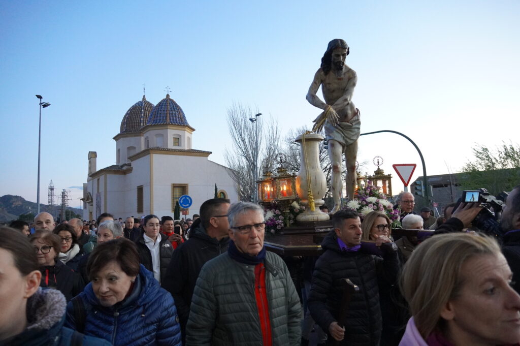 El Cristo Amarrado a la Columna ya está en Jumilla. La venerada imagen de Salzillo partió de su morada habitual, el convento franciscano de Santa Ana del Monte, acompañada de cientos de fieles y devotos, hasta llegar a la ermita de San Agustín, y entrar a reverenciar a la Patrona de Jumilla, la Virgen de la Asunción, y seguir su camino hasta la iglesia de Santiago.