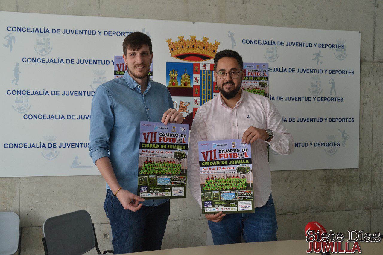 Con la de este año son ya siete las ediciones que Globality Sports viene realizando el Campus de Fútbol Ciudad de Jumilla, como siempre con Sergio Campos e Iván Navarro a la cabeza del mismo. “Los campus son eventos que, por experiencia, no suelen durar más de tres, cuatro o cinco años. Nosotros vamos por la séptima y la gente sigue teniendo ganas de venir. Algo estaremos haciendo bien”, recalcaba uno de los responsables y entrenadores del campus, Sergio Campos, en la presentación realizada en la sala de prensa de la Piscina Cubierta Municipal, en la que compareció acompañado por el concejal de Deportes, Juan Manuel García.