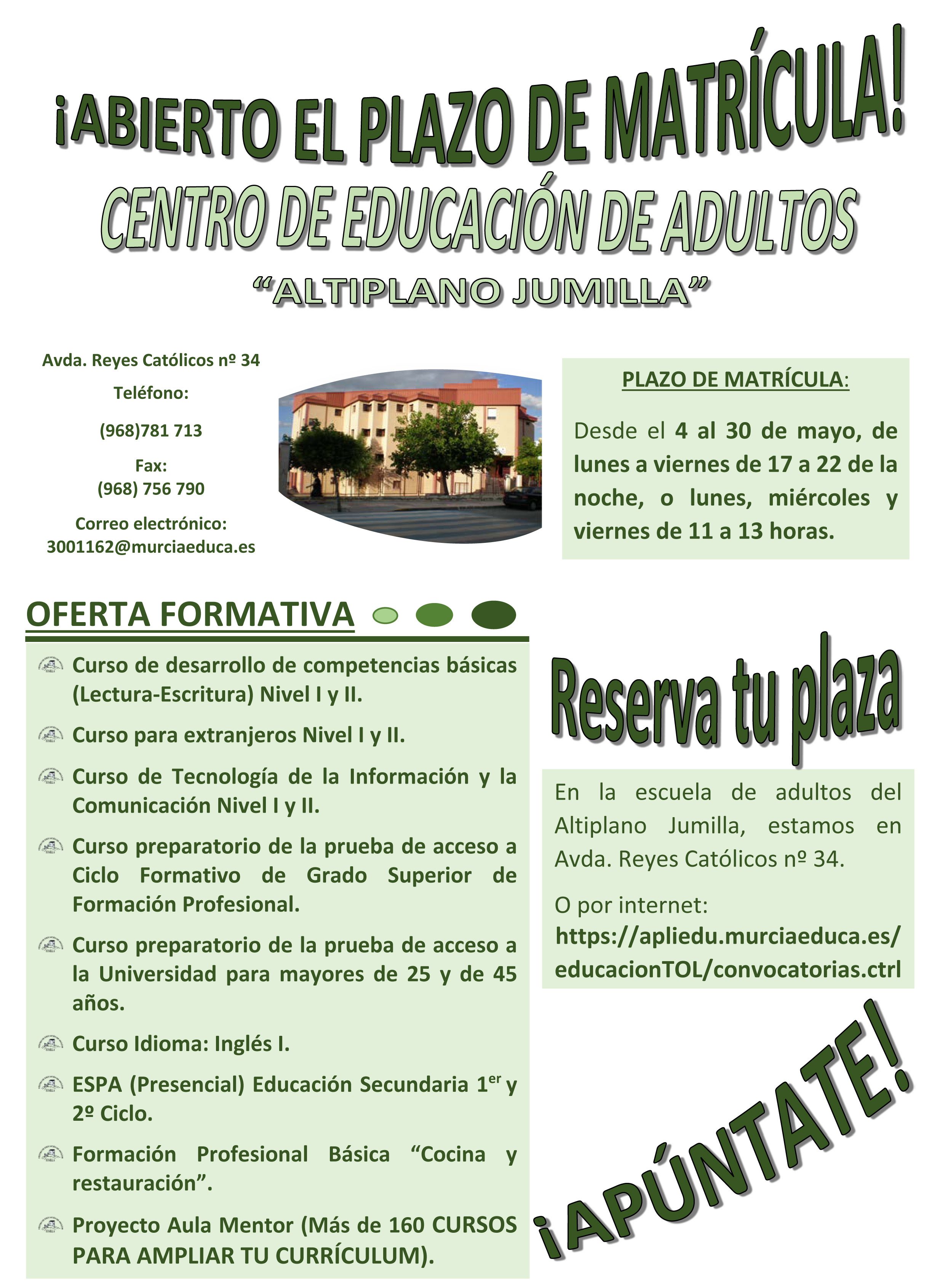 El Centro de Educación de Adultos de Jumilla ha abierto el plazo de matrículas. Los interesados pueden reservar su plaza hasta el 30 de mayo en el propio centro (avenida de Reyes Católicos, 34) de lunes a viernes de 17 a 22 horas o los lunes, miércoles y viernes de 11 a 13 horas. También se puede hacer la solicitud en el enlace: https://apliedu.murciaeduca.es/educacionTOL/convocatorias.ctrl.