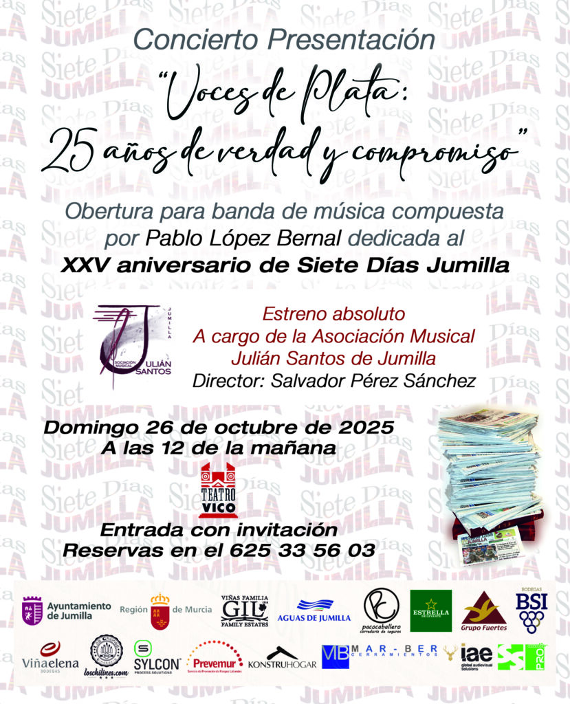 El próximo domingo 26 de octubre, a las 12 de la mañana, el Teatro Vico de Jumilla va a acoger la clausura de los actos conmemorativos de los 25 años de prensa local, que se han organizado con motivo del XXV aniversario del periódico Siete Días Jumilla.