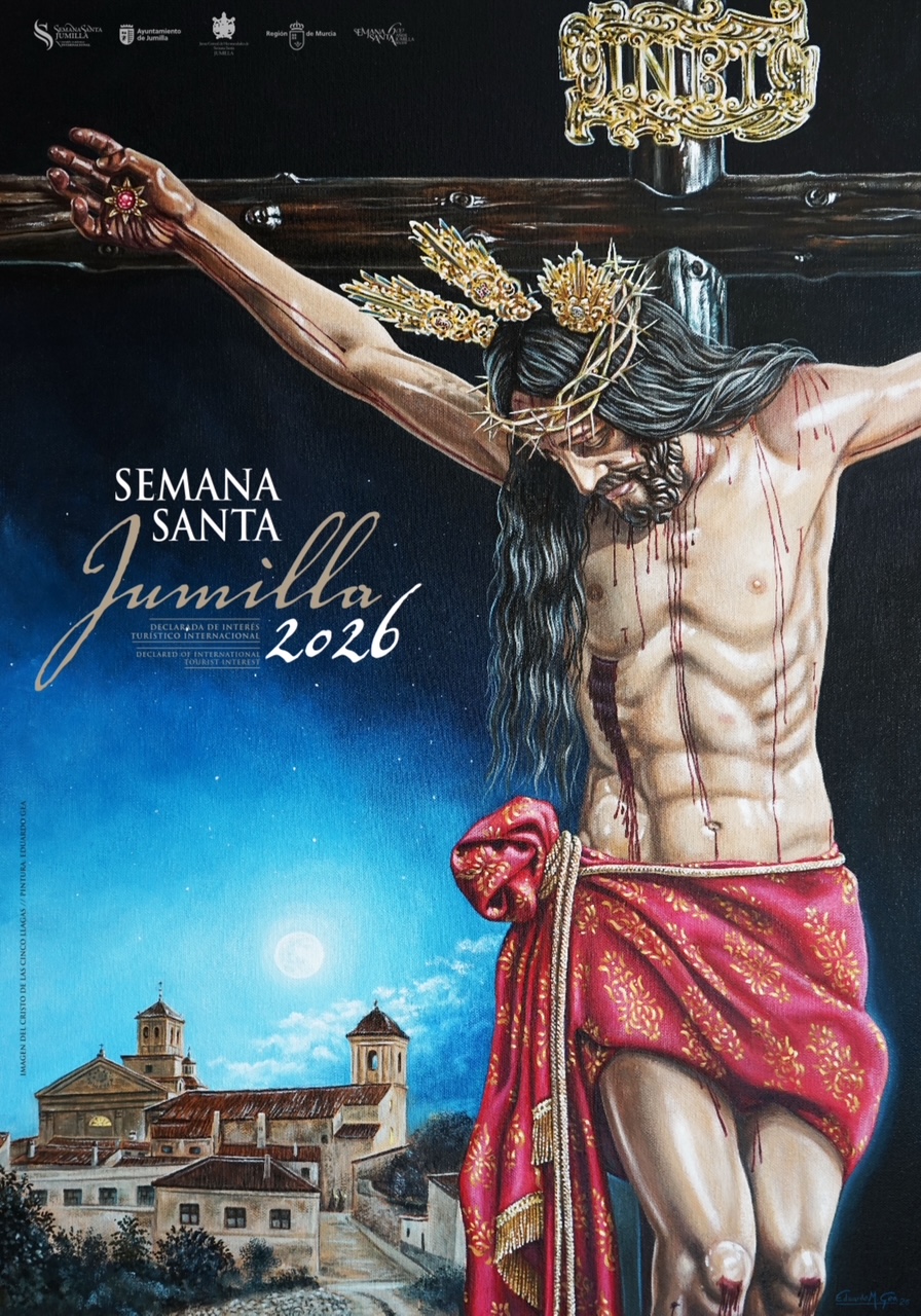 En la composición del cartel se ha representado una vista antigua de Jumilla donde aparece la Iglesia Mayor de Santiago y la de Santa María, “por ser enclaves donde están los orígenes de las primeras hermandes y procesiones”, subrayó Eduardo Gea y añadió que “aparece la iglesia de Santa María completa, con sus naves y tejados que sigue siendo hoy en día el lugar de formación de la Procesión del Santo Entierro de Viernes Santo, en la que desfila el Paso del Santísimo Cristo de las Cinco Llagas”.