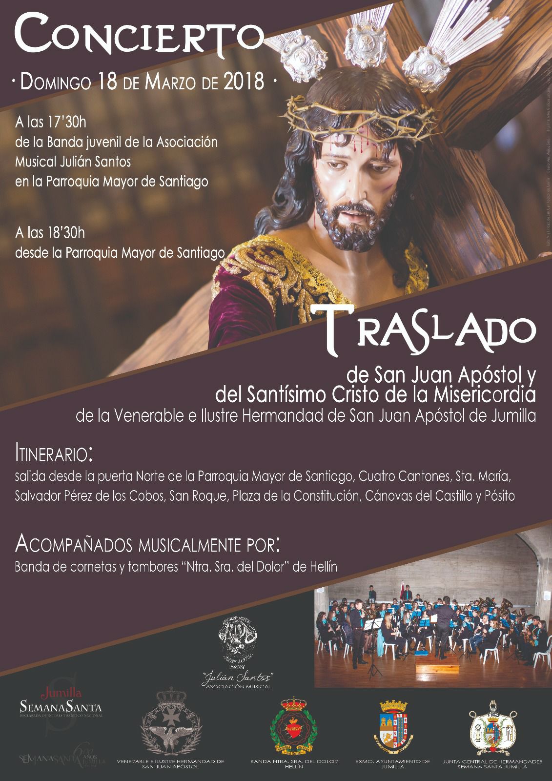Desde ahí, una hora después partirá el traslado de San Juan Apóstol y Santísimo Cristo de la Misericordia. Saldrán desde la puerta norte de la citada iglesia y discurrirá por Cuatro Cantones, Santa María, Pérez de los Cobos, San Roque, plaza de la Constitución, Cánovas del Castillo hasta Pósito. Según informan desde la hermandad, irán acompañados musicalmente por la Banda de Cornetas y Tambores Nuestra Señora del Dolor de Hellín.