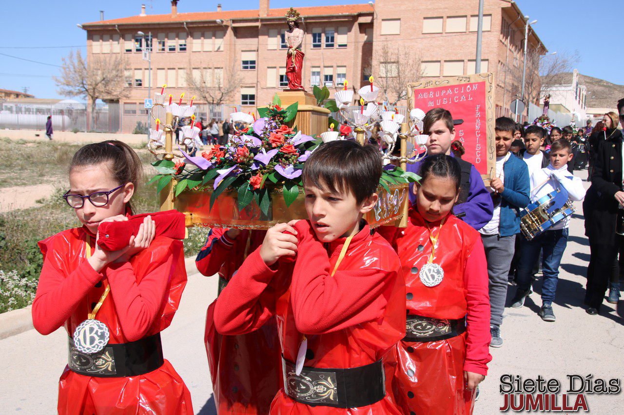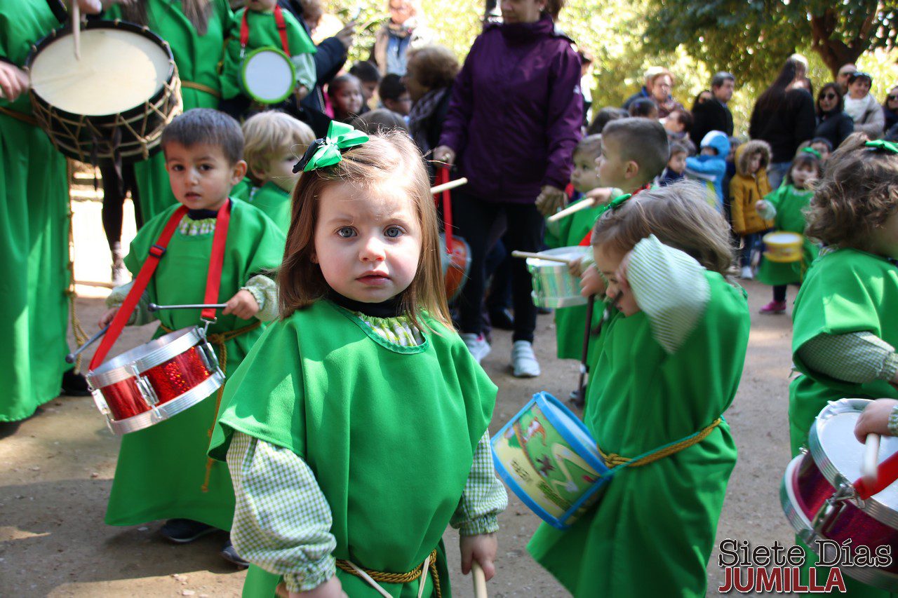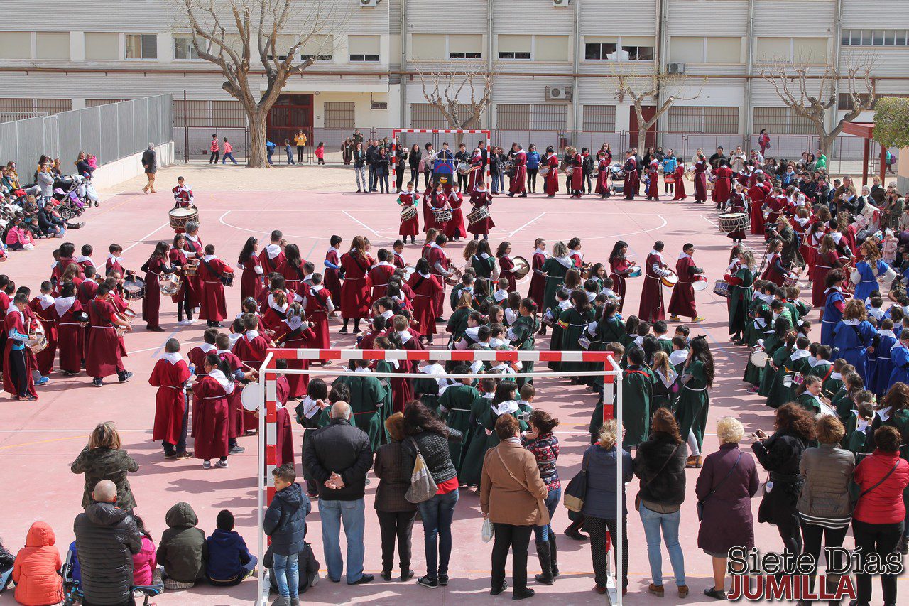 El colegio Carmen Conde realizó una sorprendente procesión, llena de orden y seriedad, como mandan los cánones. Los alumnos de primaria vistieron túnicas y capuces y portaron pasos en miniatura y los de Infantil tocaron sus tambores y pitas vestidos de armaos. Por su parte, el Miguel Hernández también repartió caramelos y puso música en la calle con su banda de flautas dulces.