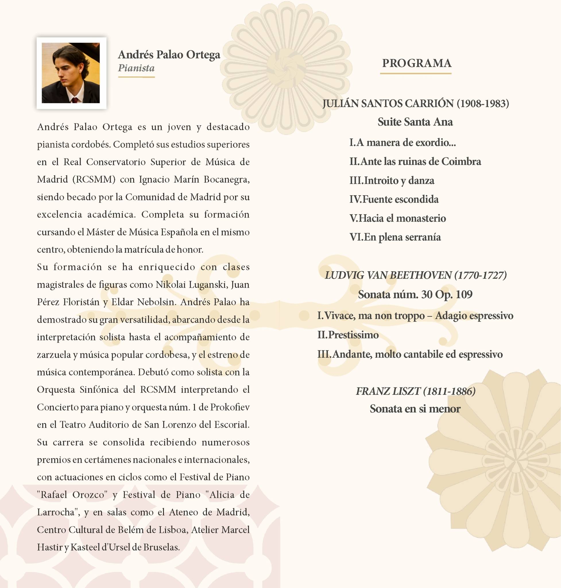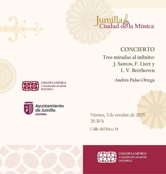 El pianista cordobés Andrés Palao Ortega ofrece mañana el concierto titulado ‘Tres miradas al infinito’ en el que interpretará obras del compositor jumillano Julián Santos, L. V Beethoven y Franz Liszt.