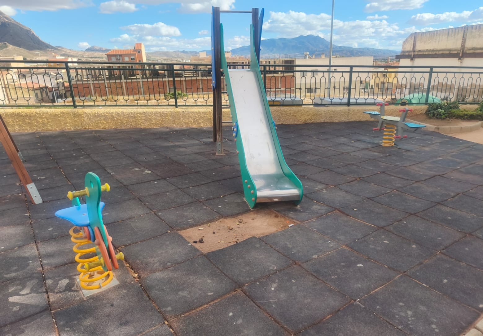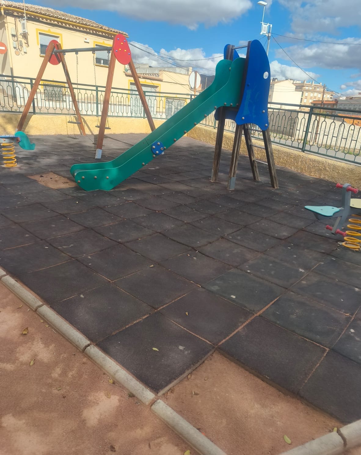 La portavoz Juana Guardiola declara que “hemos observado como la solera de caucho del área infantil está en muy mal estado debido al paso del tiempo, y esto supone un riesgo para la seguridad de los niños.