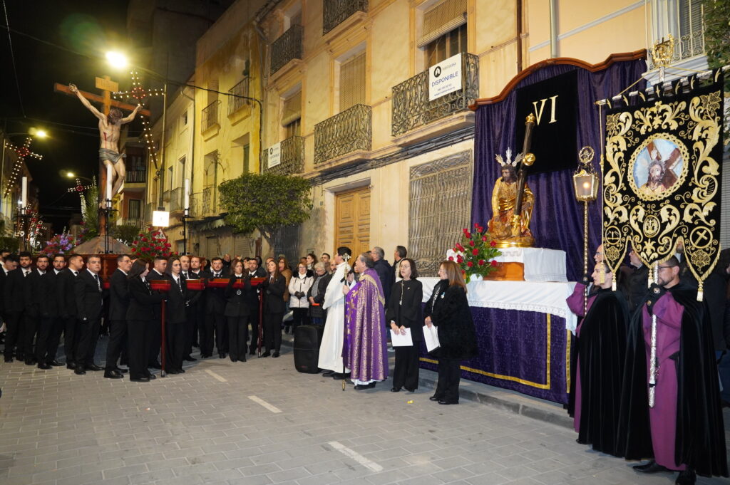 La imagen del Cristo del Perdón, que preside el Vía Crucis, este año ha sido portada por anderos y anderas de la Hermandad de la Virgen de la Soledad, e iba recorriendo los diferentes pasos donde se procedía a la lectura pertinente en cada estación.