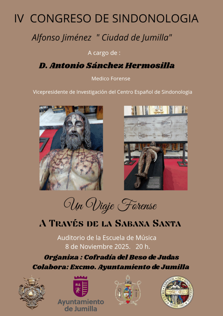 Bajo el título “Un viaje forense a través de la Sabana Santa”, este próximo sábado se celebra el IV Congreso de Sindonología Alfonso Jiménez Ciudad de Jumilla. Este año la conferencia correrá a cargo de Alfonso Sánchez Hermosilla, médico forense y vicepresidente de investigación del Centro Español de Sindonología.