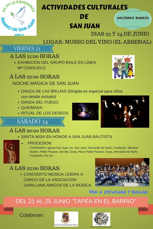 La Asociación de Vecinos La Esperanza del Barrio de San Juan invita a todos los vecinos y jumillanos en general a disfrutar de las actividades organizadas con motivo de la festividad de San Juan.