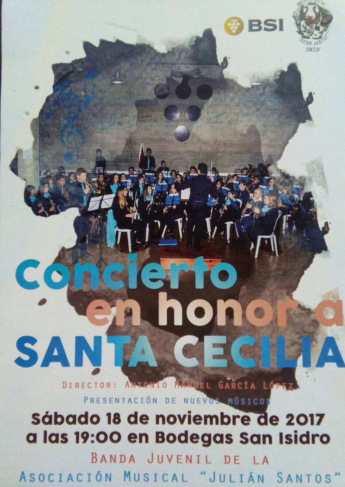—También la Asociación Musical Julián Santos ha organizado como viene siendo habitual, una serie de actividades en las que se implican asociación, escuela y bandas, tanto la juvenil como la titular, para conmemorar a la patrona de los músicos. De esta manera, lo más inmediato será mañana sábado que celebrarán el concierto en honor a Santa Cecilia a cargo de la Banda Juvenil que estará dirigida por Antonio Manuel García López, y además presentarán a los nuevos valores musicales. El concierto tendrá lugar en las instalaciones de Bodegas San Isidro a las 19:00 horas. Posteriormente al concierto se ofrecerá un vino a todos los asistentes. El precio de la entada es 5 euros.