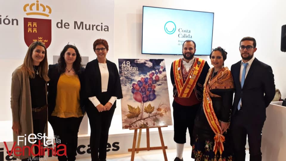 En el estand de la Región de Murcia han procedido a la presentación del cartel de la 48º Fiesta de la Vendimia de Jumilla, obra de Luis Ruiz Blázquez, donde han estado presentes además de los Vendimiadores Mayores, Juanjo Pérez e Isabel Gilar, la concejal de Festejos, Pilar Martínez, acompañando a la alcaldesa Juana Guardiola, y la secretaria del Consejo Regulador, Carolina Martínez Origone.