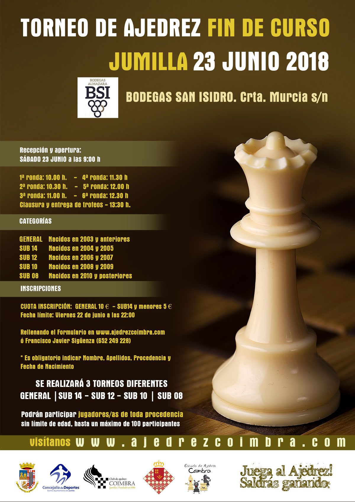 El Coimbra Jumilla organiza como cada año el Torneo de Ajedrez Fin de Curso 2018 en Bodegas San Isidro, con la colaboración de la Concejalía de Deportes y la Federación de Ajedrez de la Región de Murcia.
