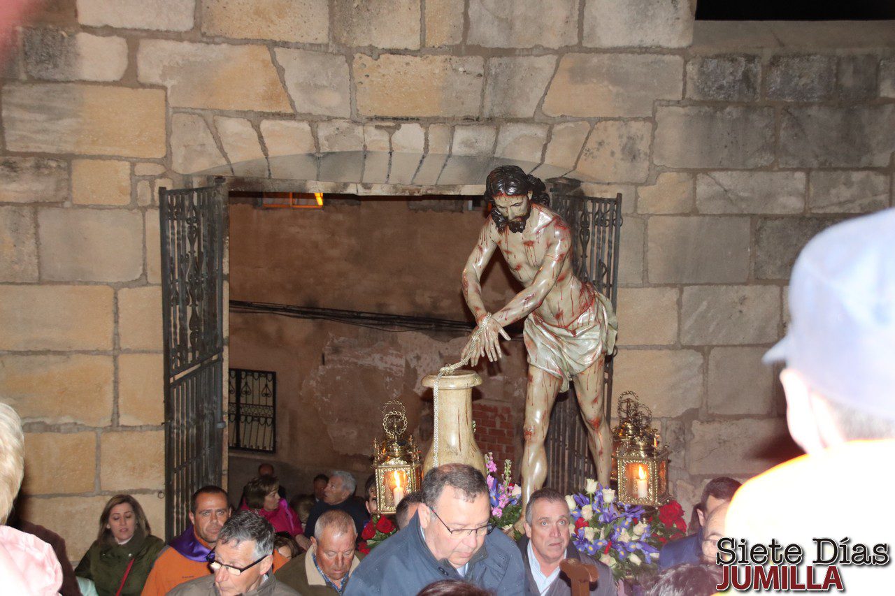 El Cristo Amarrado a la Columna está ya en Jumilla, tras el traslado que tradicionalmente se efectúa la tarde de Domingo de Ramos de la imagen, desde el convento de Santa Ana hasta la parroquia de Santiago, donde permanecerá hasta el segundo domingo de mayo, que como manda la tradición, volverá a su morada franciscana.