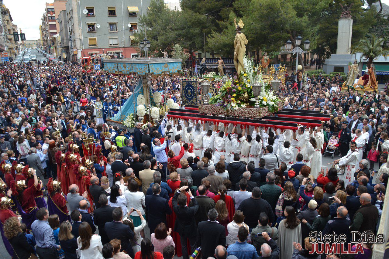 Y amanece la festiva mañana del Domingo de Resurrección que partirá tras el encuentro de Cristo con su madre y el tradicional caracol de los Armaos. El recorrido se inicia sobre las doce del mediodía desde el jardín del Rollo con la participación de once imágenes y la alegre música de pasodobles. Como colofón a esta procesión y a la Semana Santa, llega la caramelada con la que se celebran los muchos meses de trabajo y esfuerzo de todos los implicados en estas fiestas religiosas.