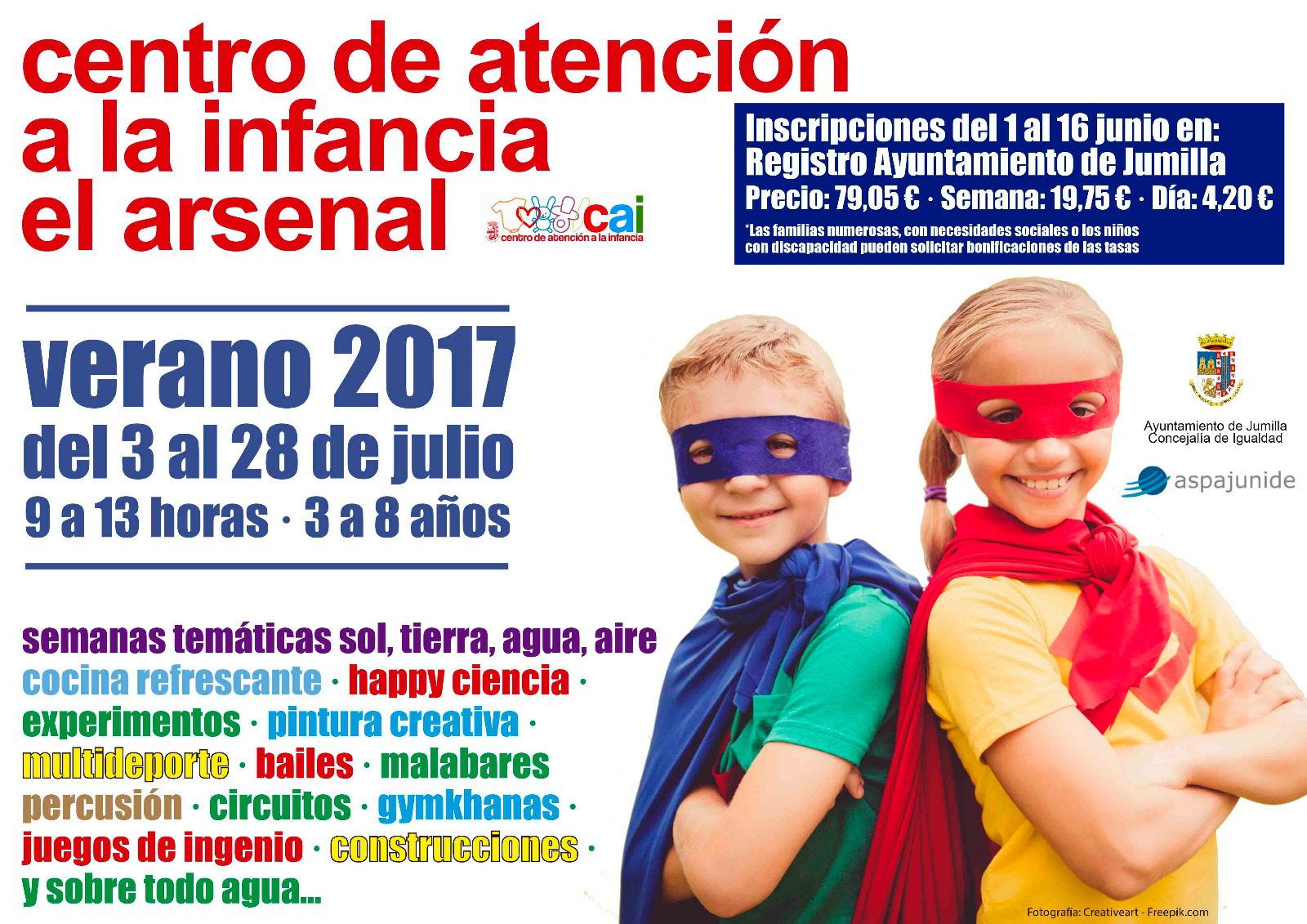 Hoy jueves se abre el plazo de inscripción de alumnos para la Escuela de Verano del Centro de Atención a la Infancia El Arsenal. Las actividades darán comienzo el 3 de julio y finalizarán el 28 del mismo mes. Se llevarán a cabo de lunes a viernes en horario de 9 a 13 horas y podrán tomar parte niños de entre 3 y 8 años.