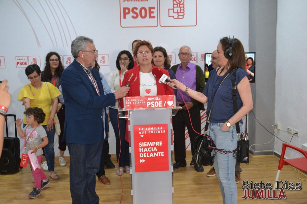 Pasadas las once y media de la noche, salía a comparecer ante los medios de comunicación y ante los asistentes Juana Guardiola, candidata a la alcaldía de Jumilla por el PSOE y triunfadora de la noche. Le acompañaron los integrantes que han formado su candidatura.