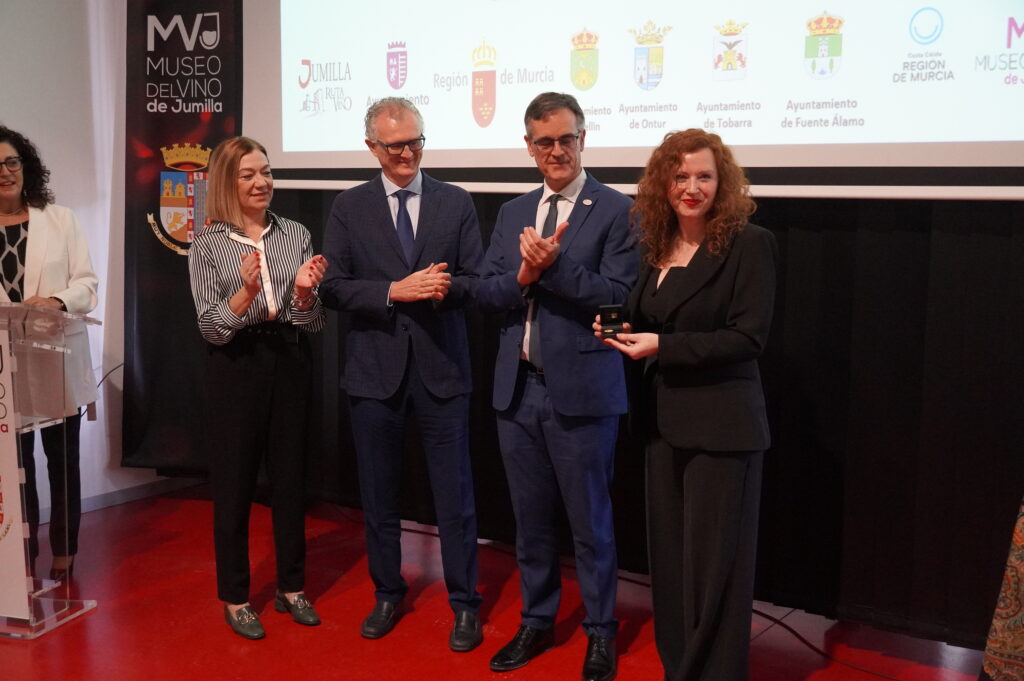 El momento central llegó con la entrega de la Insignia de la Ruta del Vino a Carla Salgado, amiga personal de Diego González, que no pudo estar presente debido a su apretada agenda de intervenciones quirúrgicas, esta vez en Sanghai. También se le entregó un detalle artístico, obra de Bartolomé Medina, que representa el Castillo y la Peña Rubia de Jumilla, acompañado de una tabla de surf, en alusión a una de las pasiones personales del galardonado.