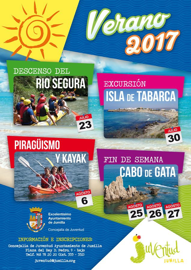 Dentro de las actividades programadas por la Concejalía de Juventud, el domingo 23 de julio se llevará a cabo un descenso del Río Segura, entre Cieza y Abarán que incluye bocadillo y refresco. La salida será a las 9.15 horas estando previsto el regreso a las 14.30 horas. Para el 6 de agosto está prevista una jornada de piragüismo y kayak a celebrar en Mazarrón con salida a las 9.00 horas y regreso por la tarde. En ambas actividades la edad mínima es 8 años y es imprescindible saber nadar.