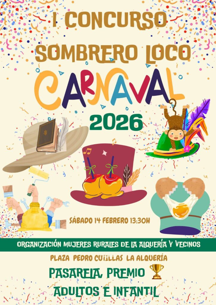 La Asociación de Mujeres Rurales y vecinos de la pedanía de La Alquería han organizado el I Concurso ‘Sombrero Loco’ para Carnaval. Será el sábado 14 de febrero a las 13:30 en la plaza Pedro Cutillas.