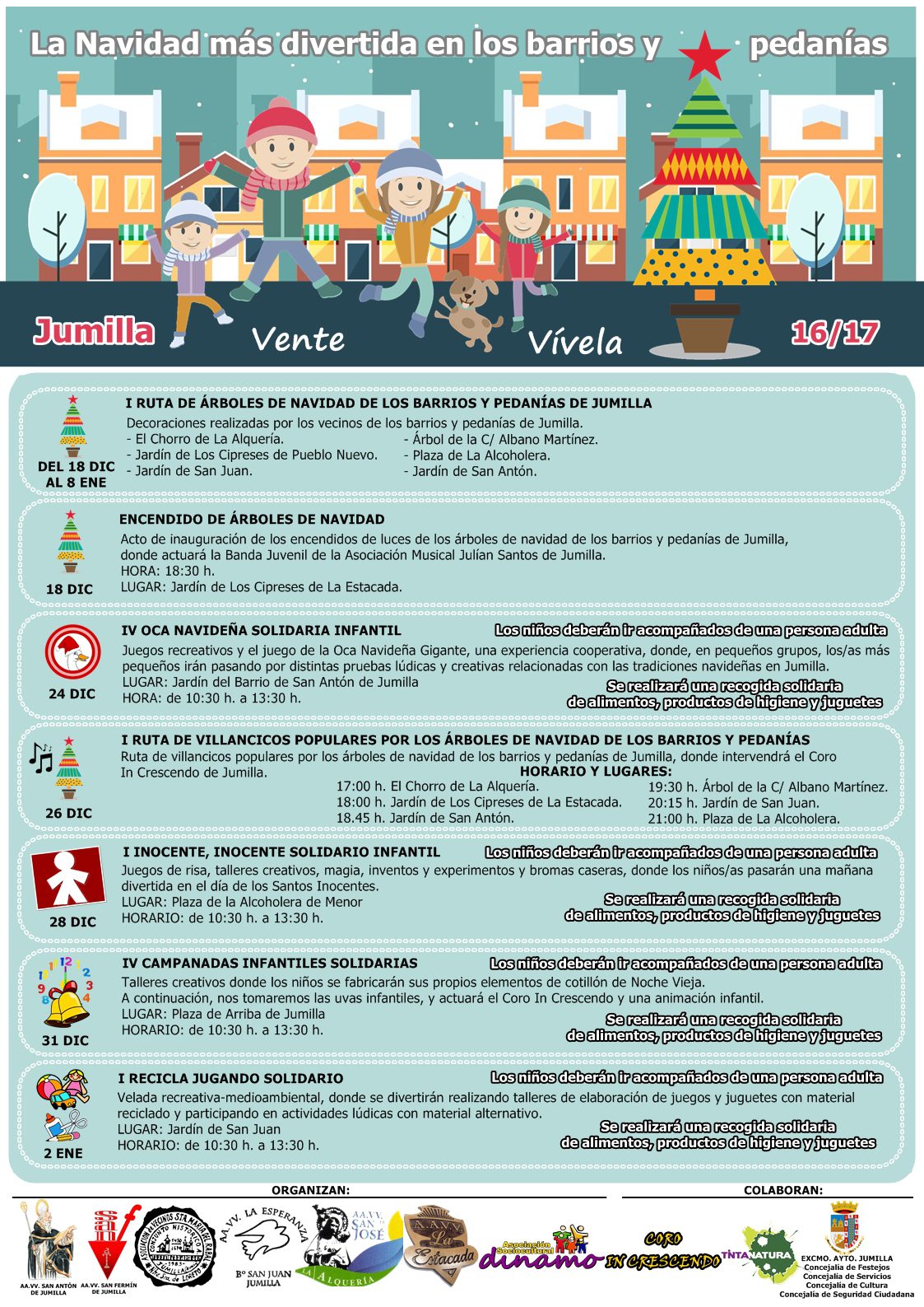 Las asociaciones de vecinos del Barrio de San Antón, San Fermín, San Juan, Casco Antiguo, La Estacada y La Alquería, junto a la Asociación Sociocultural Dinamo, y con colaboración del Ayuntamiento de Jumilla, Tinta Natura y el Coro In Crescendo, se han unido para organizar el proyecto «Navidad en los barrios de Jumilla».