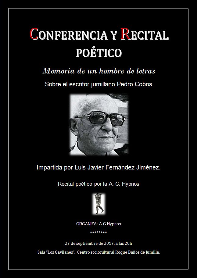 La Asociación Cultural Hypnos ha organizado una “conferencia y recital poético en memoria de un hombre de letras”, tal y como le define uno de los miembros de este colectivo. De esta manera, se trataría de un homenaje a la figura del escritor jumillano Pedro Cobos.