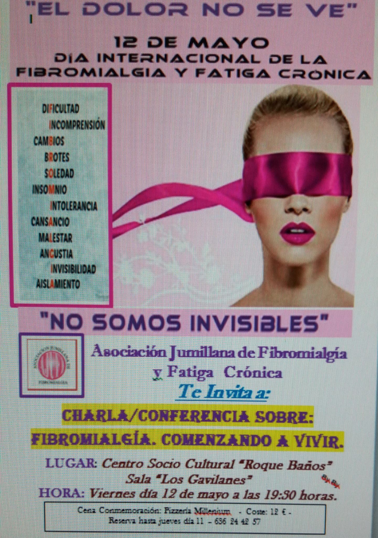 La Asociación Jumillana de Fibromialgia y Fatiga Crónica, con motivo del Día Internacional de la Fibromialgia y la Fatiga Crónica, llevará a cabo el próximo viernes 12 de mayo una charla sobre la patología, para concienciar a la población de los problemas que tienen los enfermos de fibromialgia en el día a día y para ayudar y animar a todas las personas que la sufren o que han sido recientemente diagnosticadas.