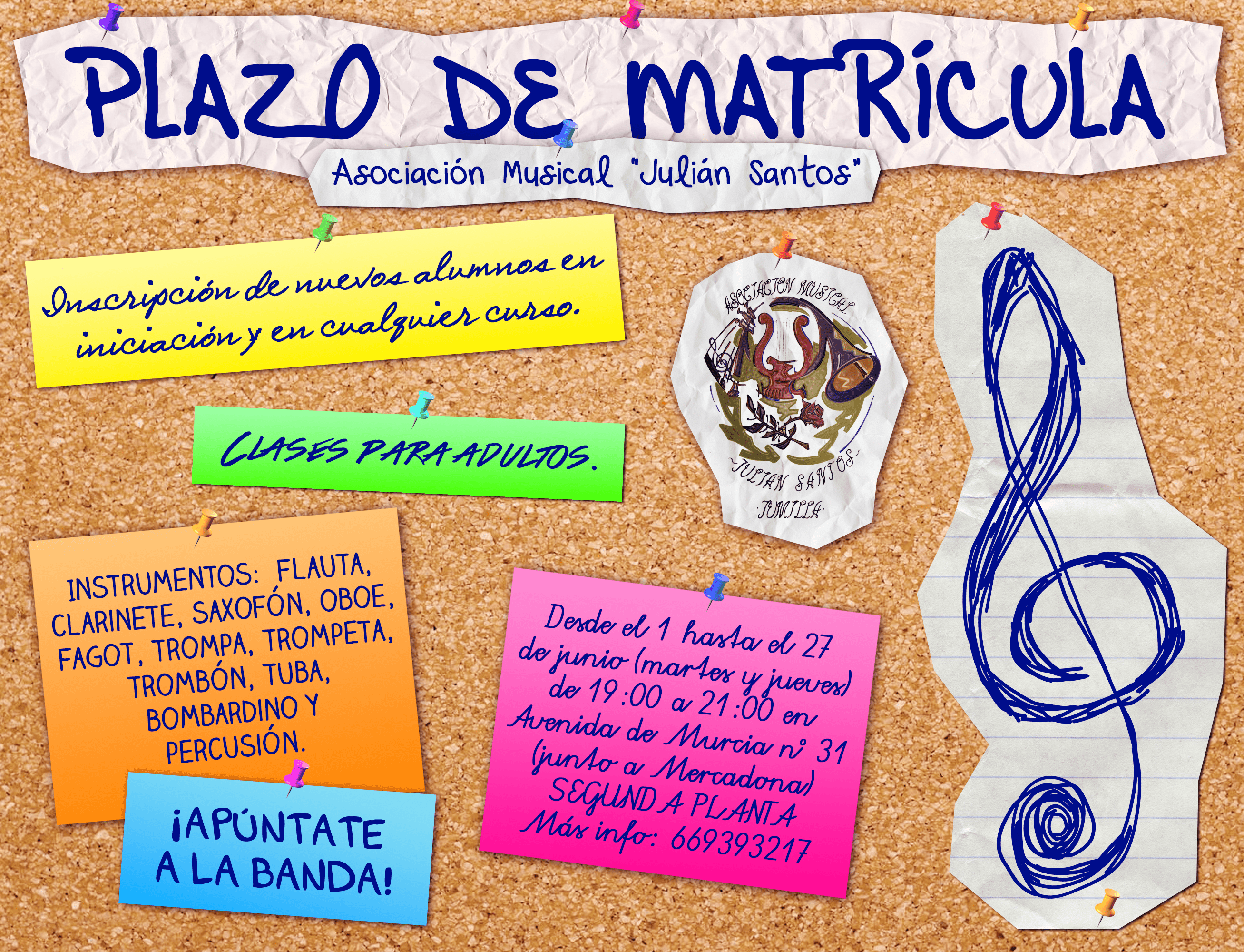 La Asociación Musical Julián Santos ha girado una circular informativa poniendo en conocimiento que ya está abierto el plazo de matrículas para el curso 2017/2018.