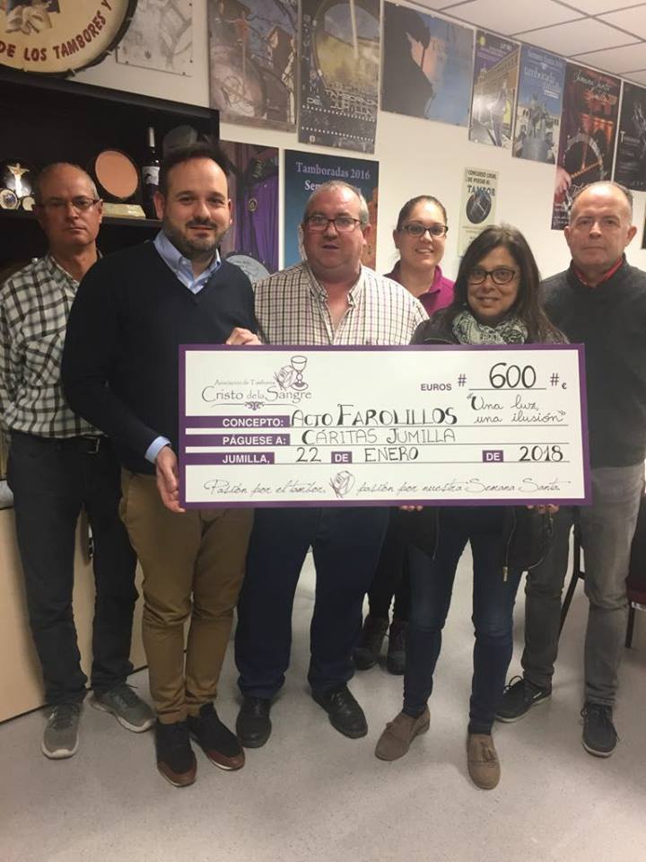 La Asociación de Tambores Cristo de la Sangre ha hecho entrega a una representante de Cáritas Jumilla de un cheque por valor de 600 euros, que fueron los que se recaudaron en el acto “Una luz, una ilusión”, en el que se lanzaron 300 farolillos solidarios el pasado día 1 de enero, desde la Plaza de Arriba.